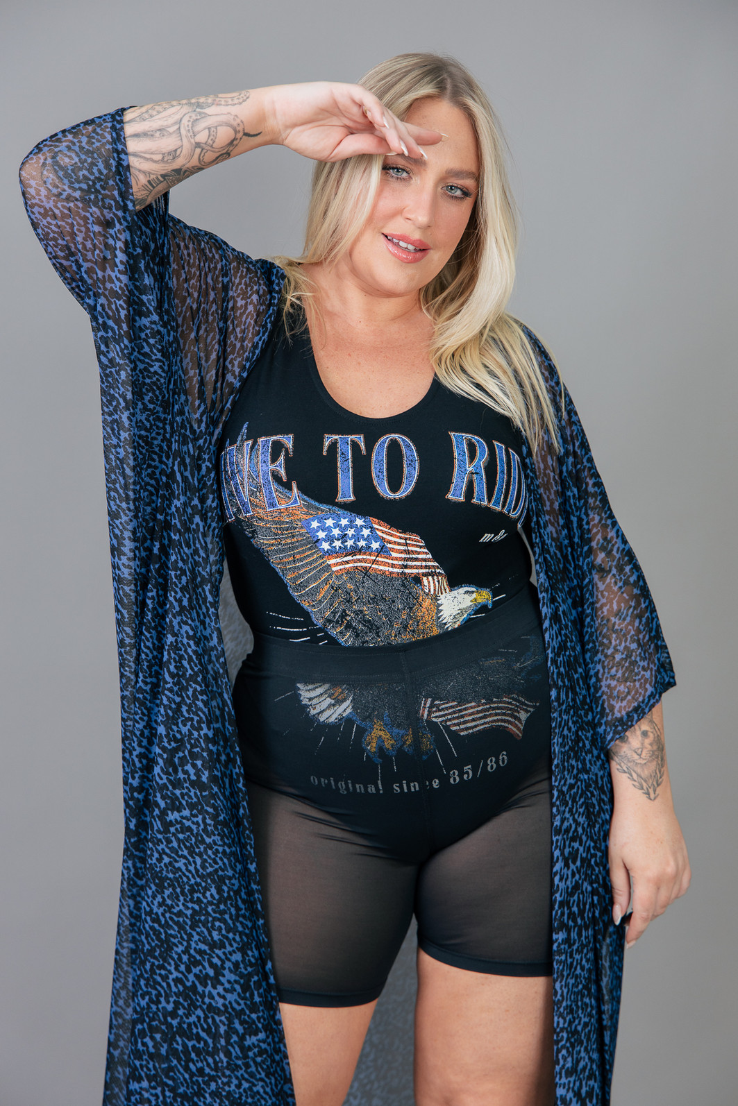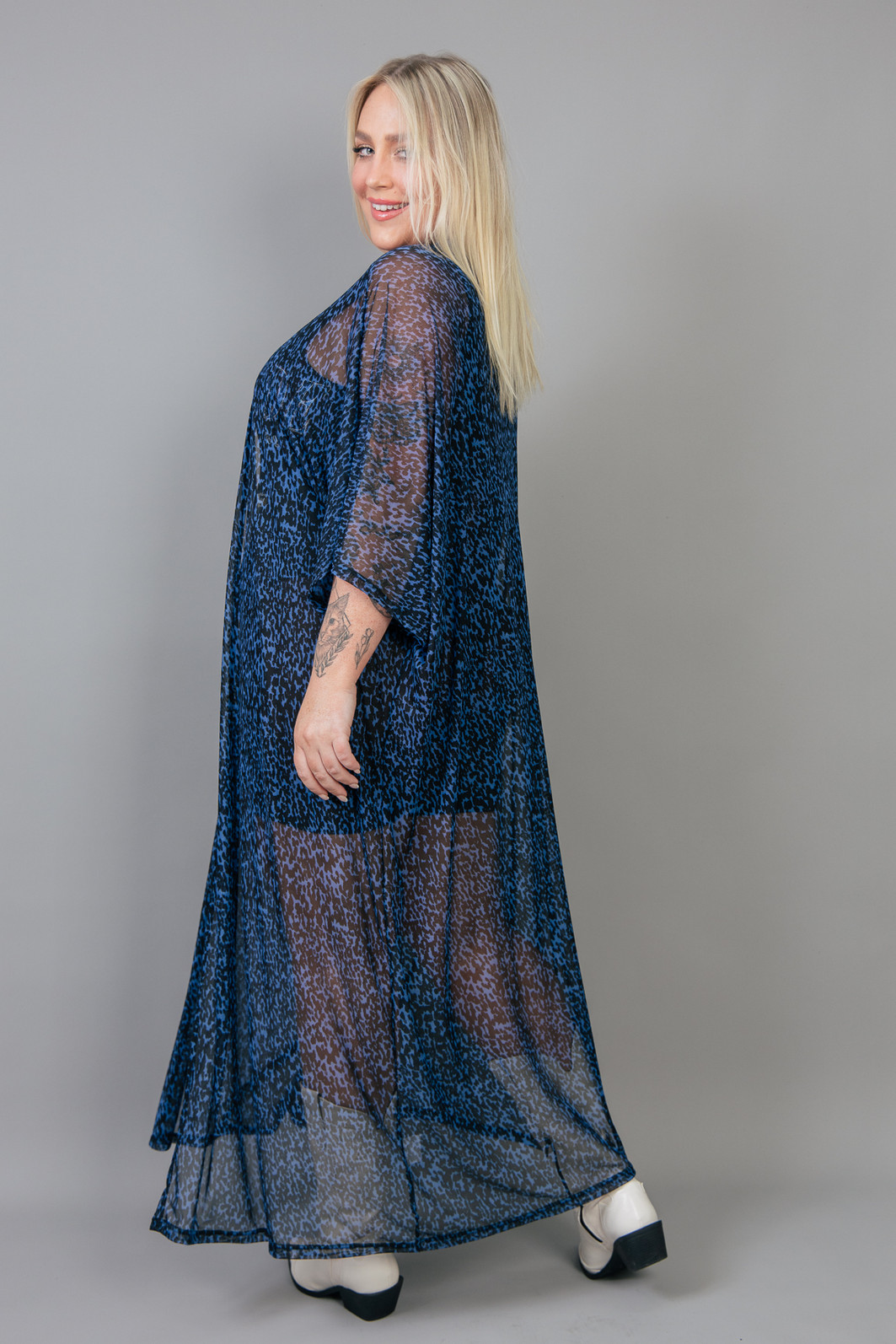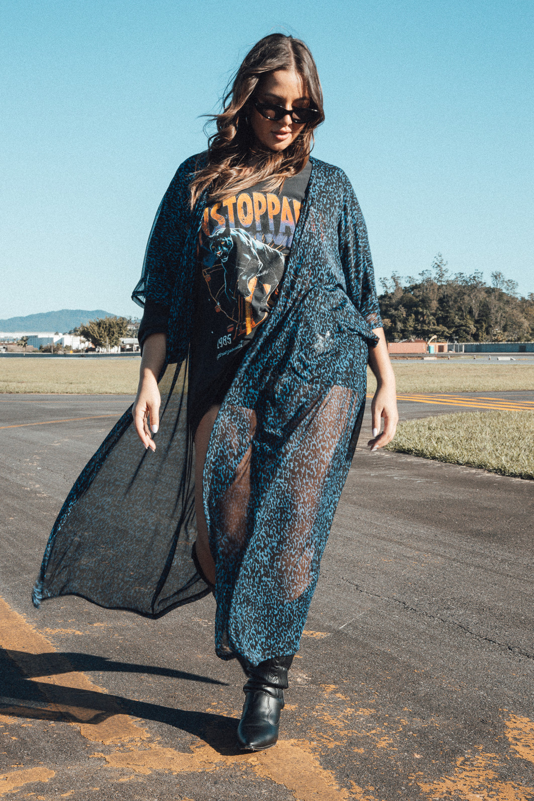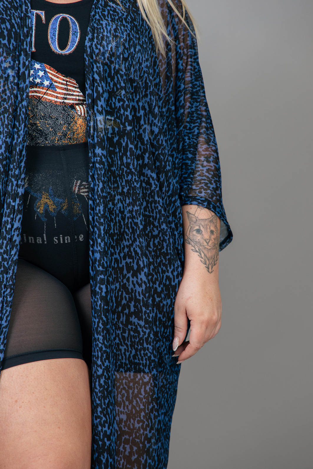 Aquela peça super estilosa que levanta qualquer look! Kimono todo em tule estampado de oncinha em tons de azul e preto. Peça ampla e leve.