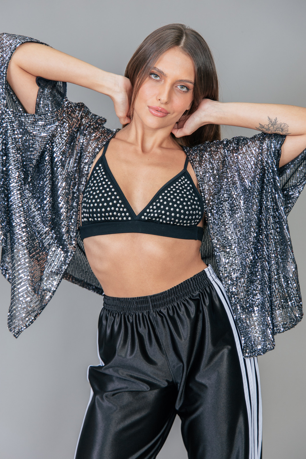 Aquela terceira peça indispensável! Kimono em tecido base de tule com paetês pratas bordados. Modelagem bem quadradona e ampla