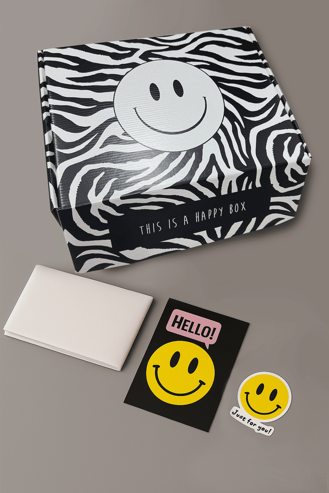 Contém: 1 Caixa smile zebra, 1 folha em papel seda, 1 sticker, 1 postal.