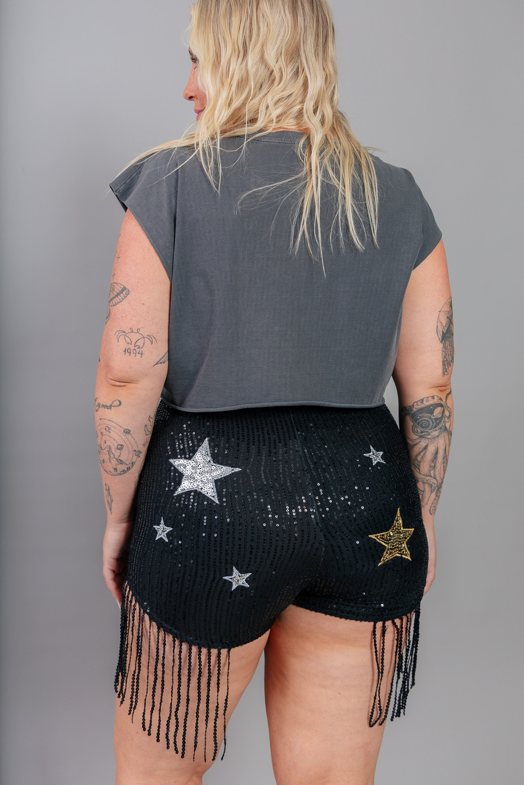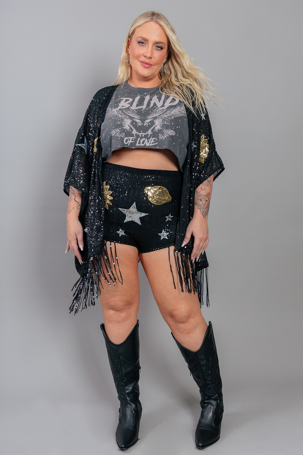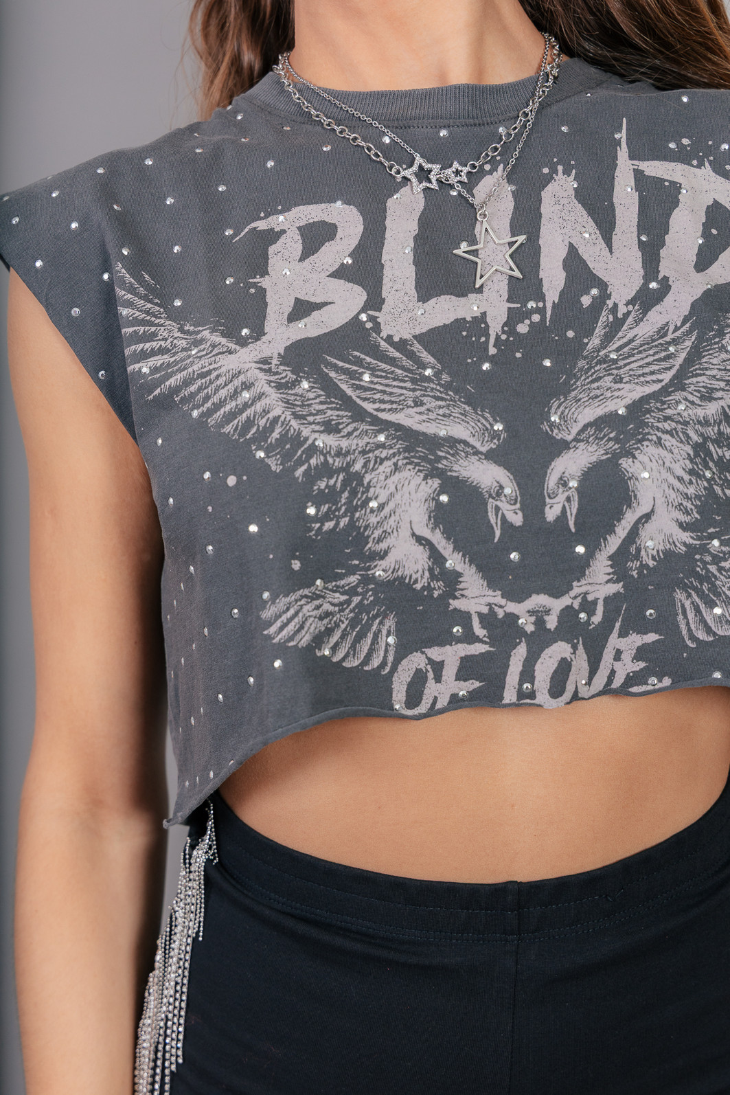 1. Cropped com modelagem mais ampla. Em malha super leve e macia tingida e estonada na cor cinza. Possui estampa e aplicação de tachas em toda a frente. Cava e barra em corte à fio.