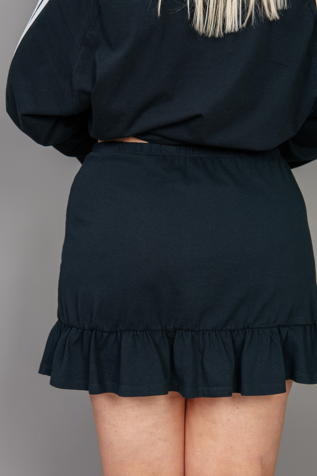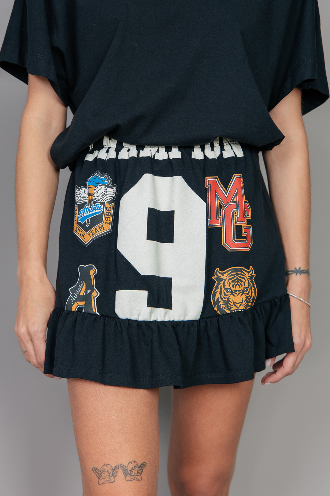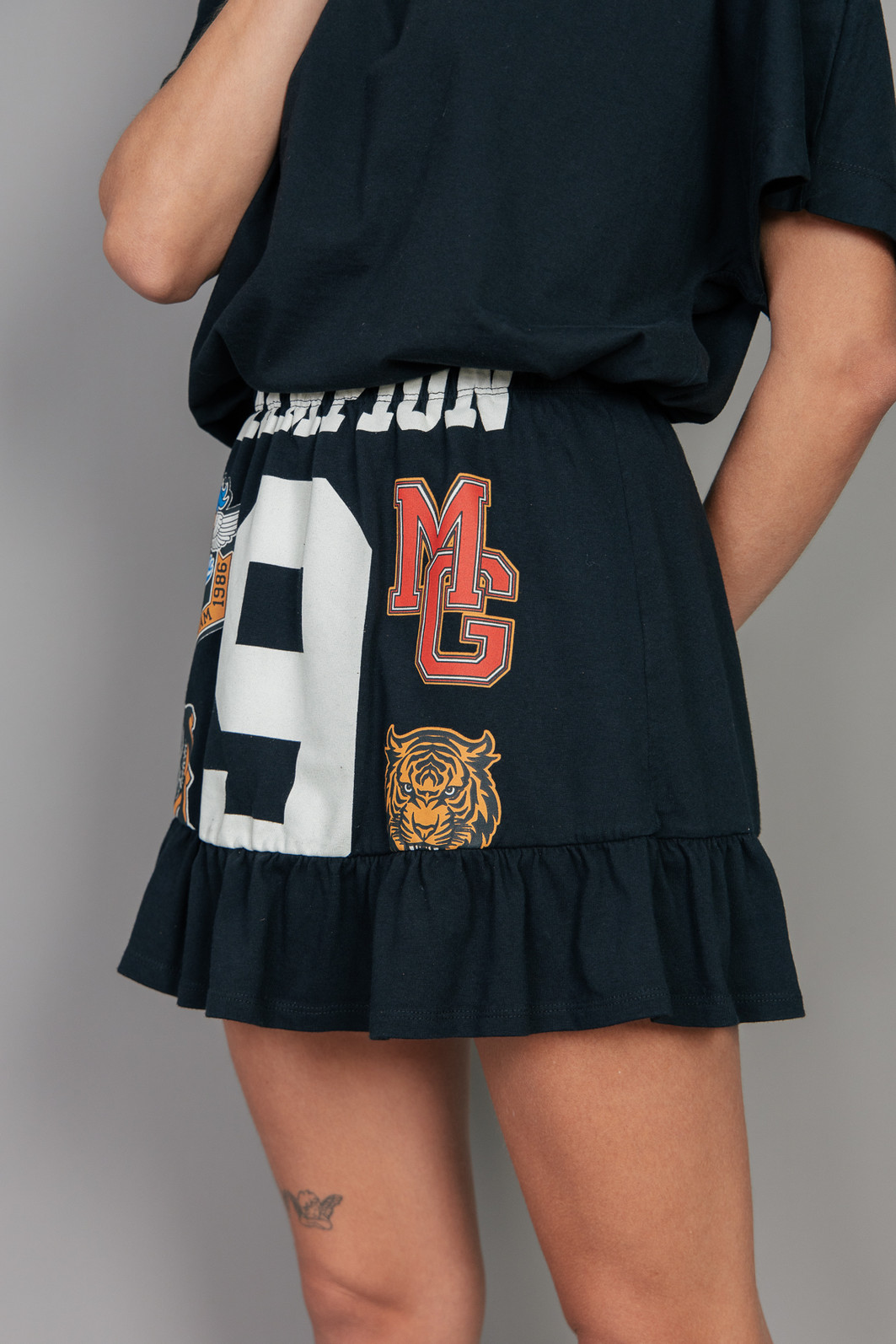 Saia super estilosa e fofa! Em malhão, ou seja, uma malha mais grossa e pesada na cor preta. Com eslástico embutido no cós para melhor servir e estampa frente estourada.