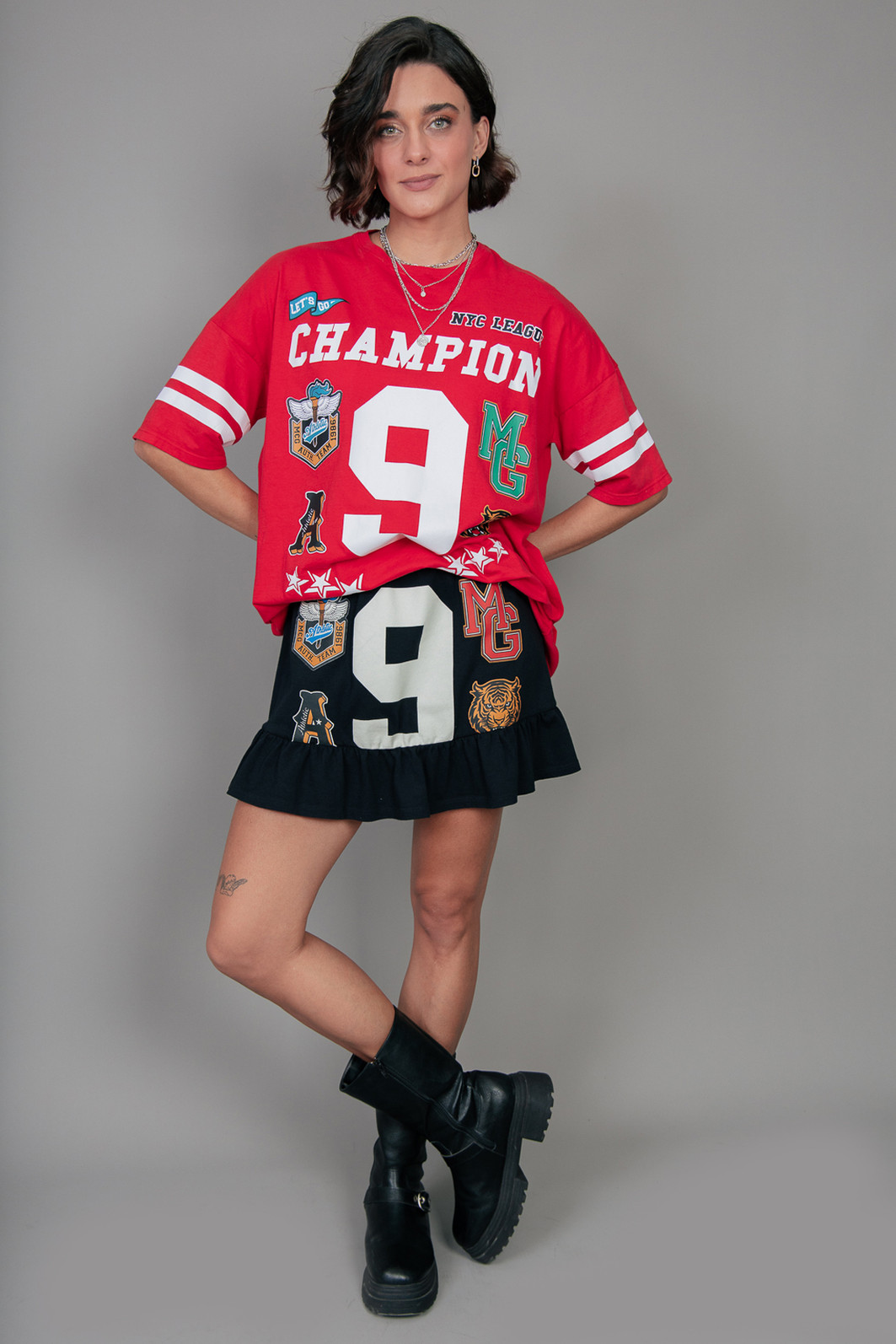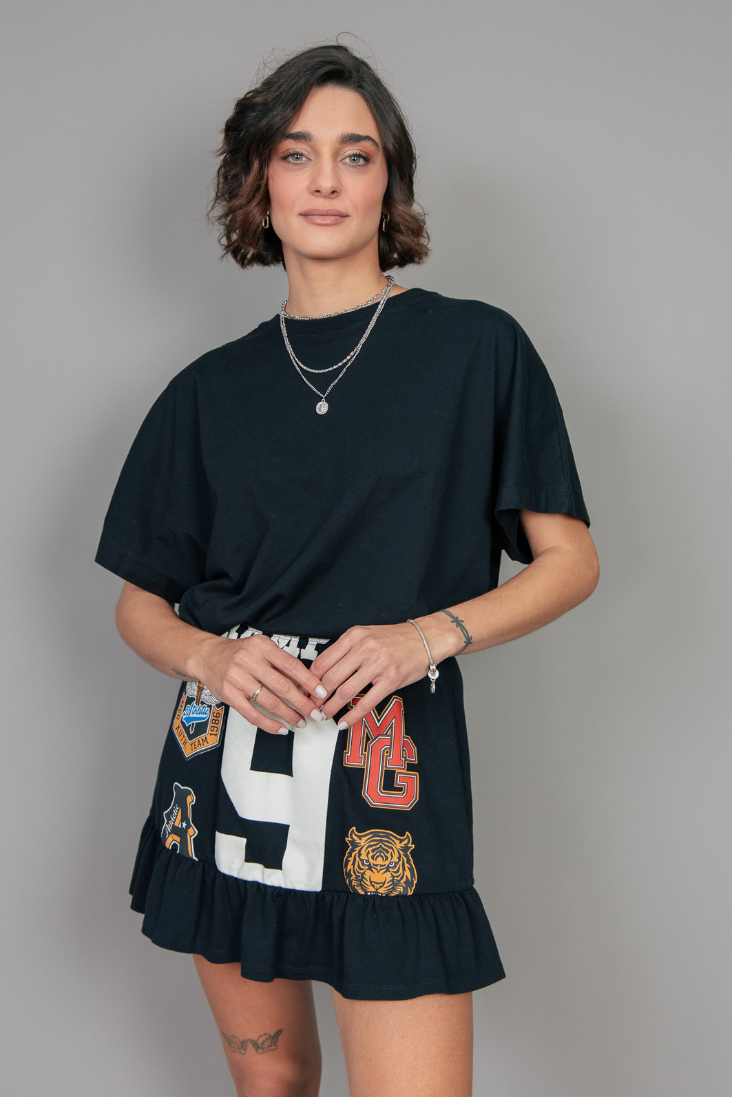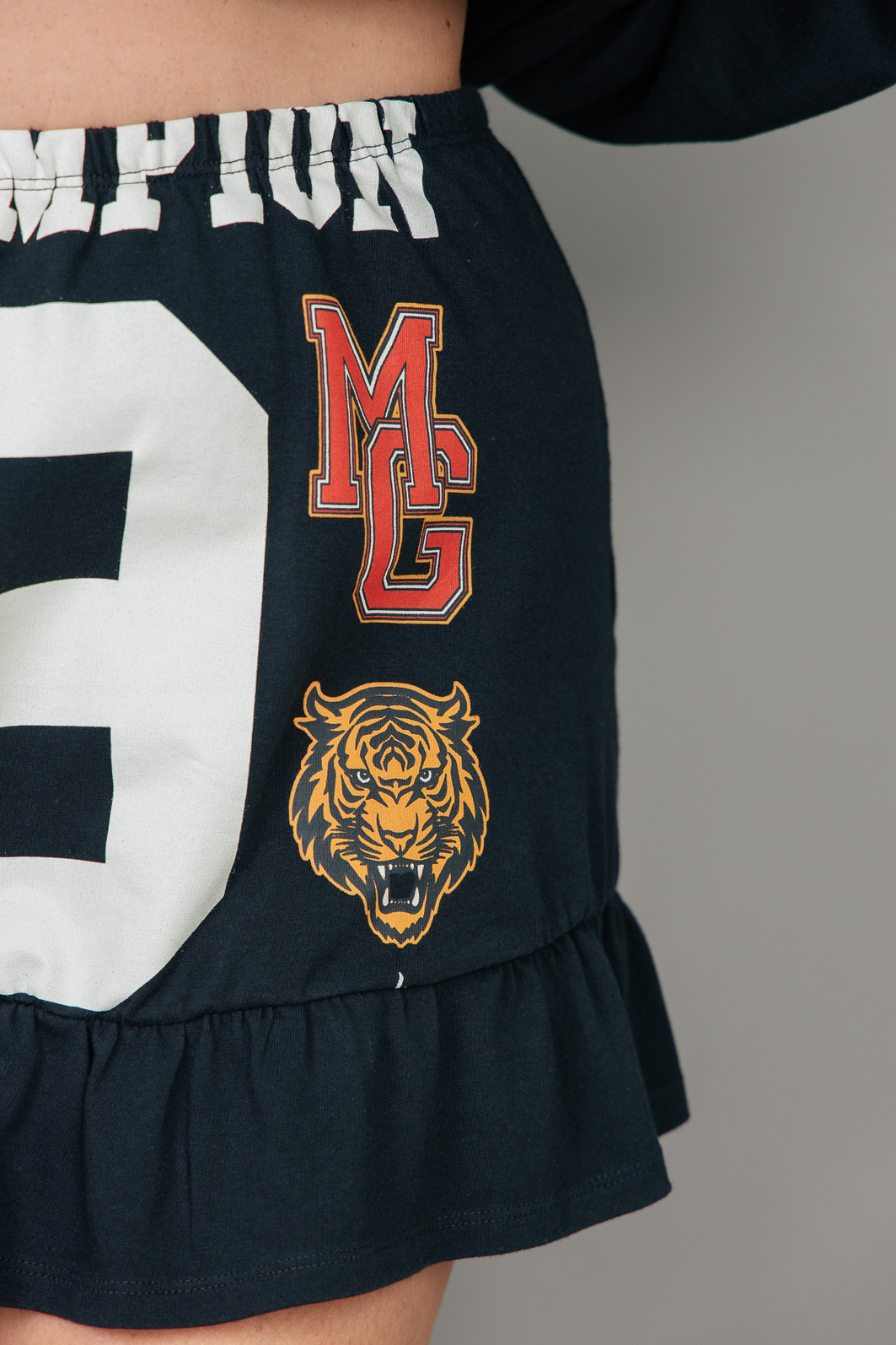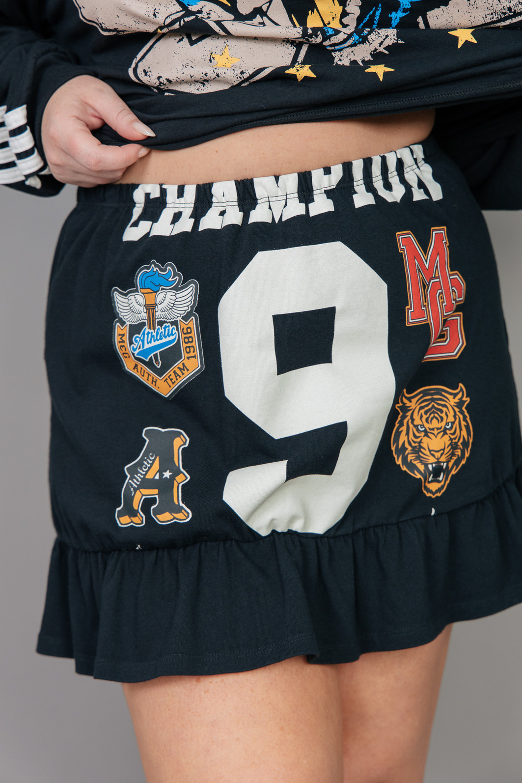 Saia super estilosa e fofa! Em malhão, ou seja, uma malha mais grossa e pesada na cor preta. Com eslástico embutido no cós para melhor servir e estampa frente estourada.