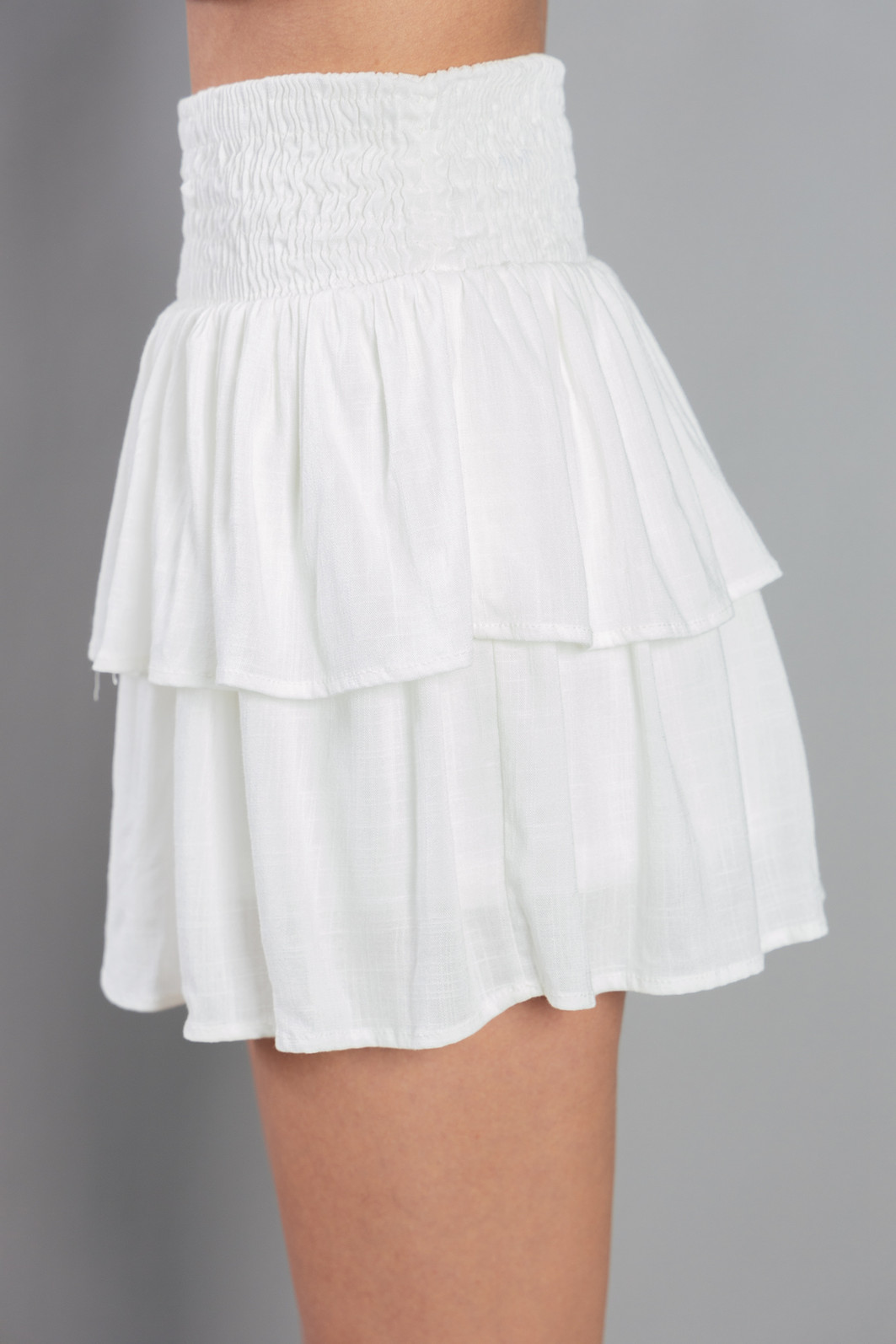 FOFUUUURAAAA! Short saia em tecido super leve e macio de viscose cor off white (não é branco). Cós todo em lastex (cintura toda em elástico). Muito confortável pois tem o shortinho por baixo :)