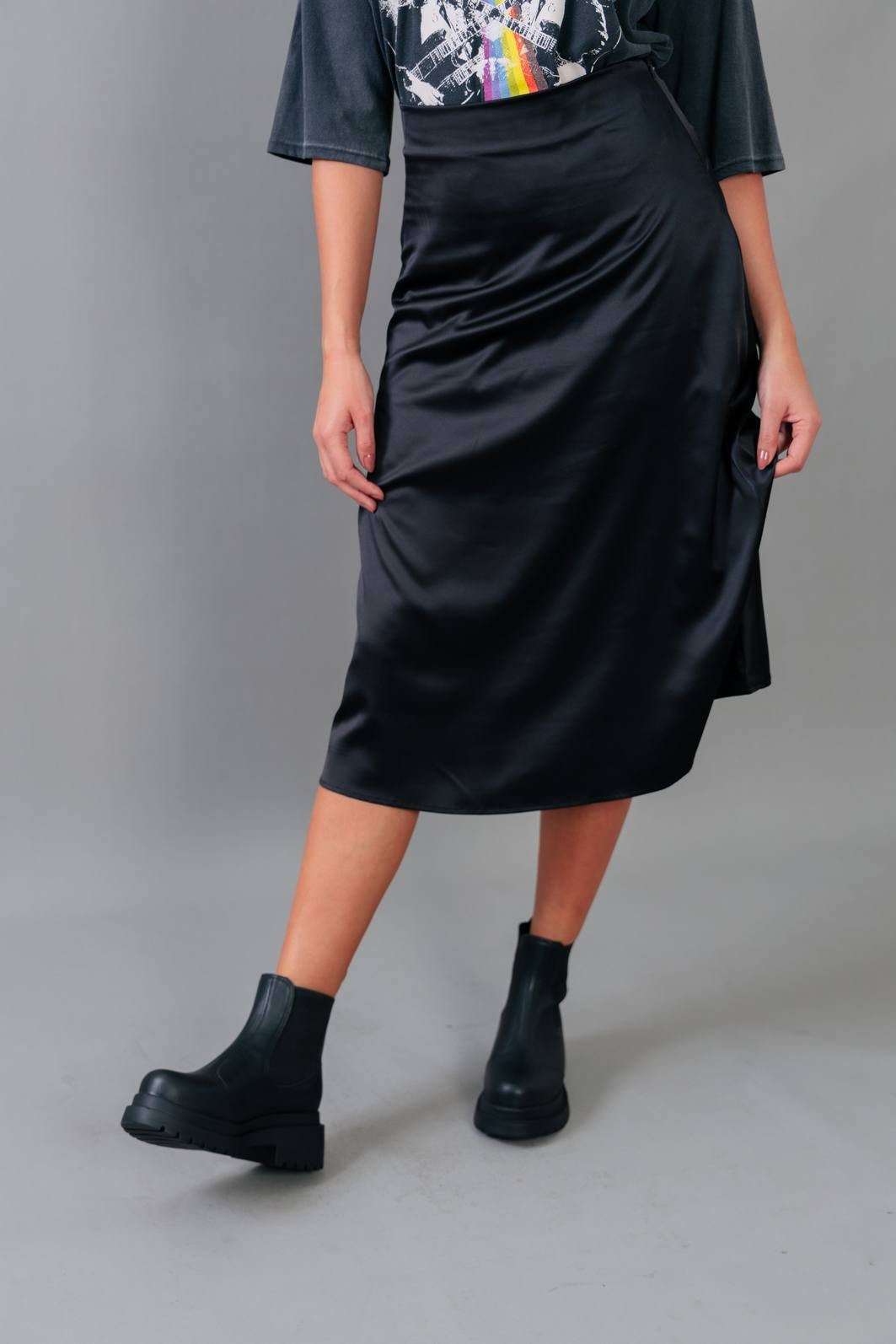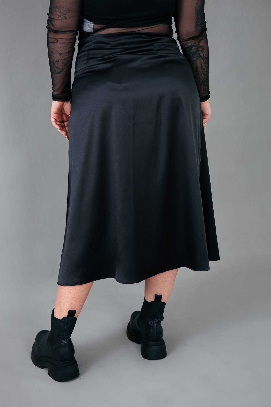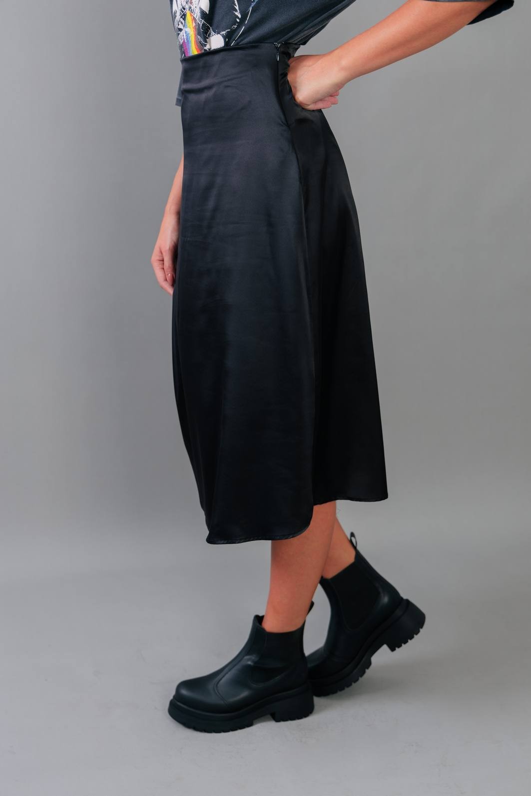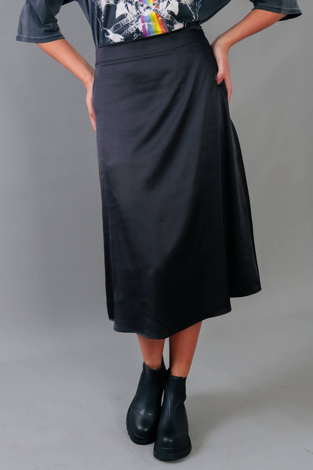 A saia trend do momento. Em tecido acetinado na cor preta. Modelagem com cintura mais alta, zíper para vestir e comprimento midi.