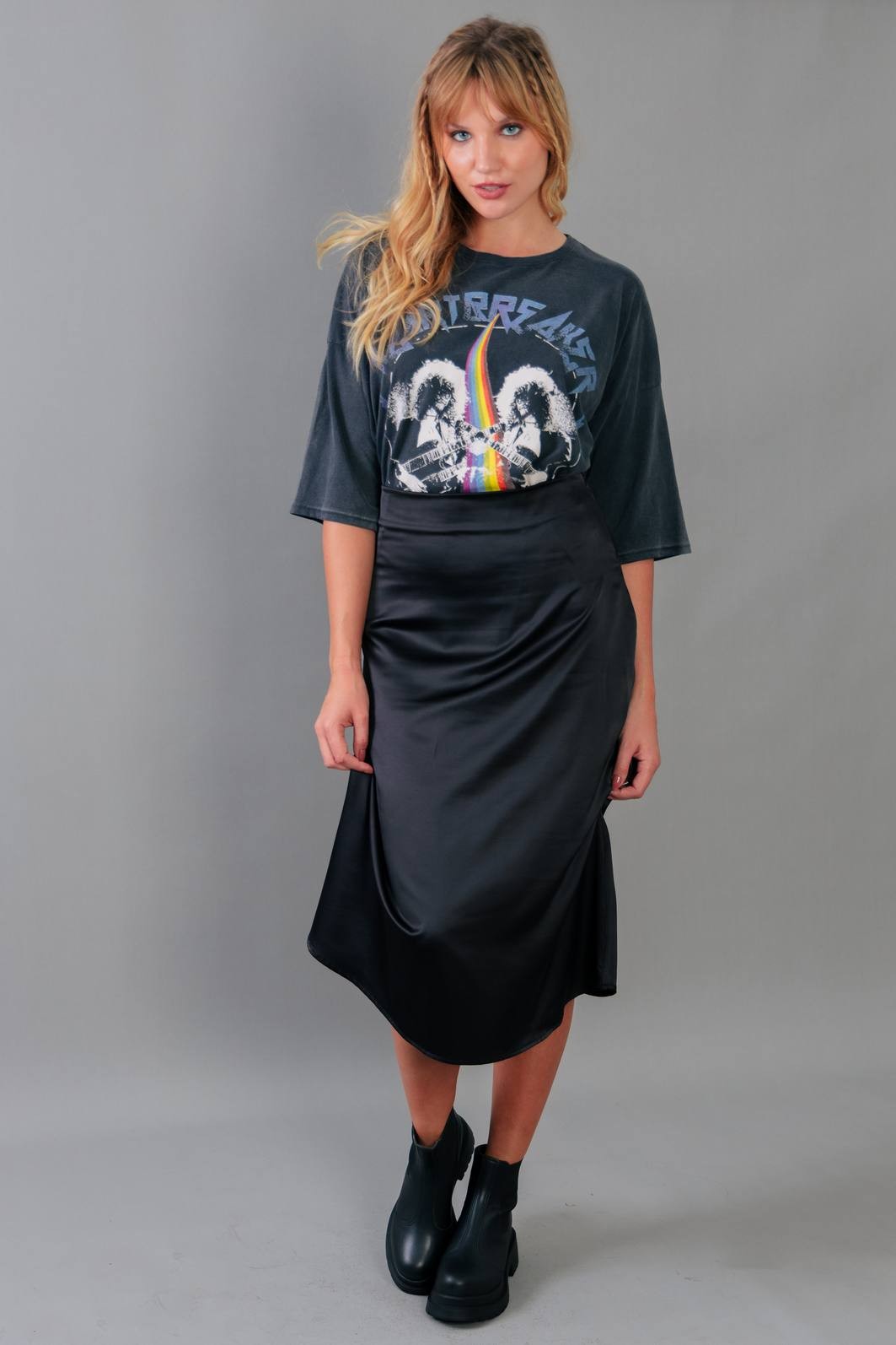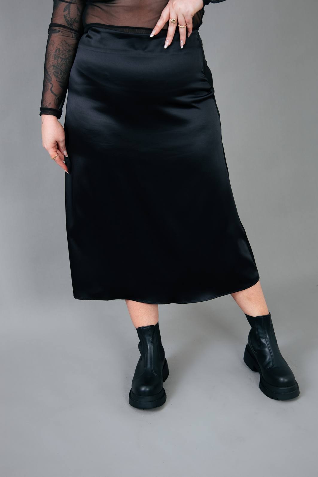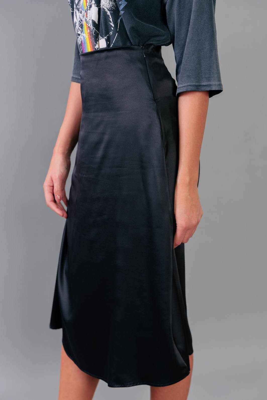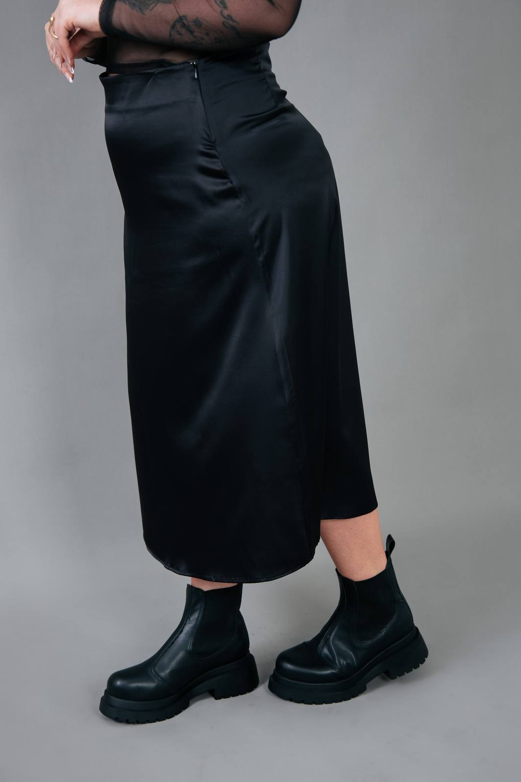 A saia trend do momento. Em tecido acetinado na cor preta. Modelagem com cintura mais alta, zíper para vestir e comprimento midi.