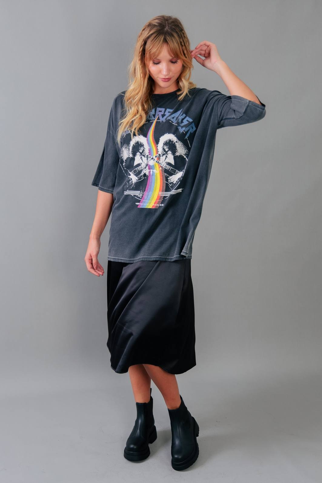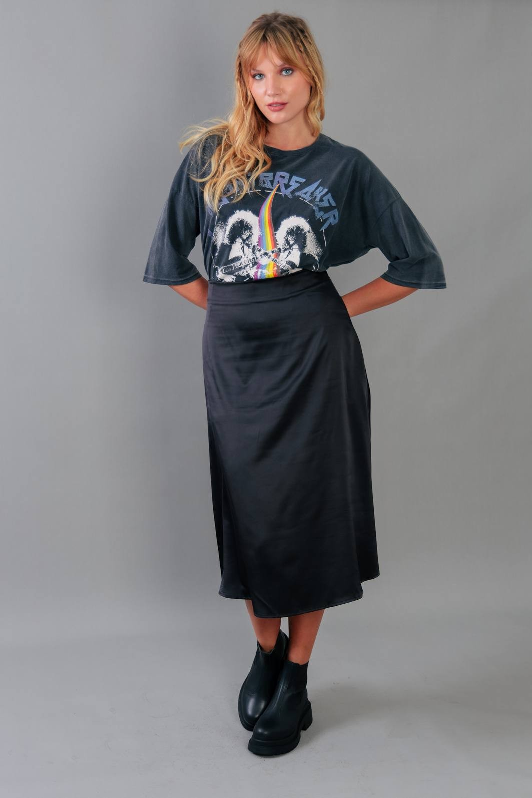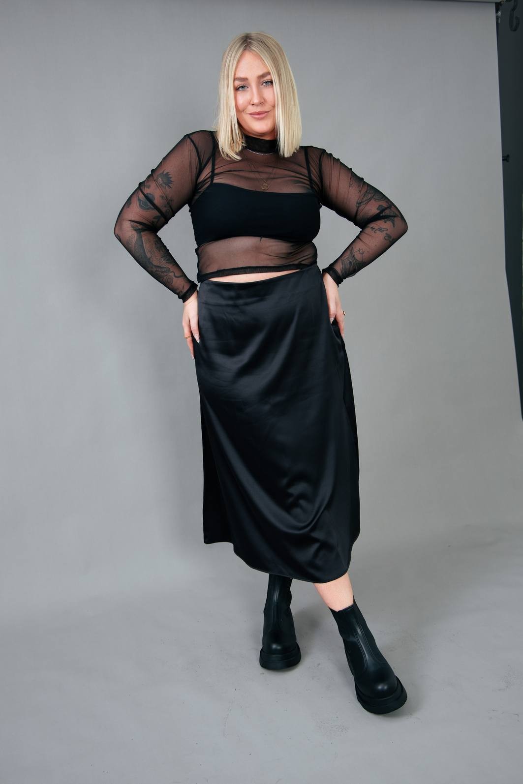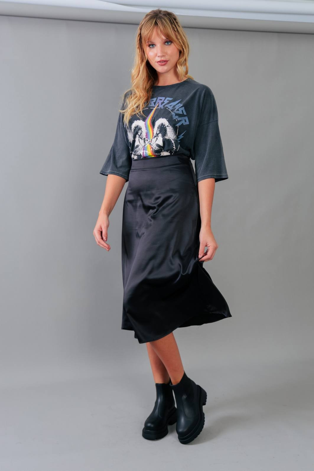 A saia trend do momento. Em tecido acetinado na cor preta. Modelagem com cintura mais alta, zíper para vestir e comprimento midi.
