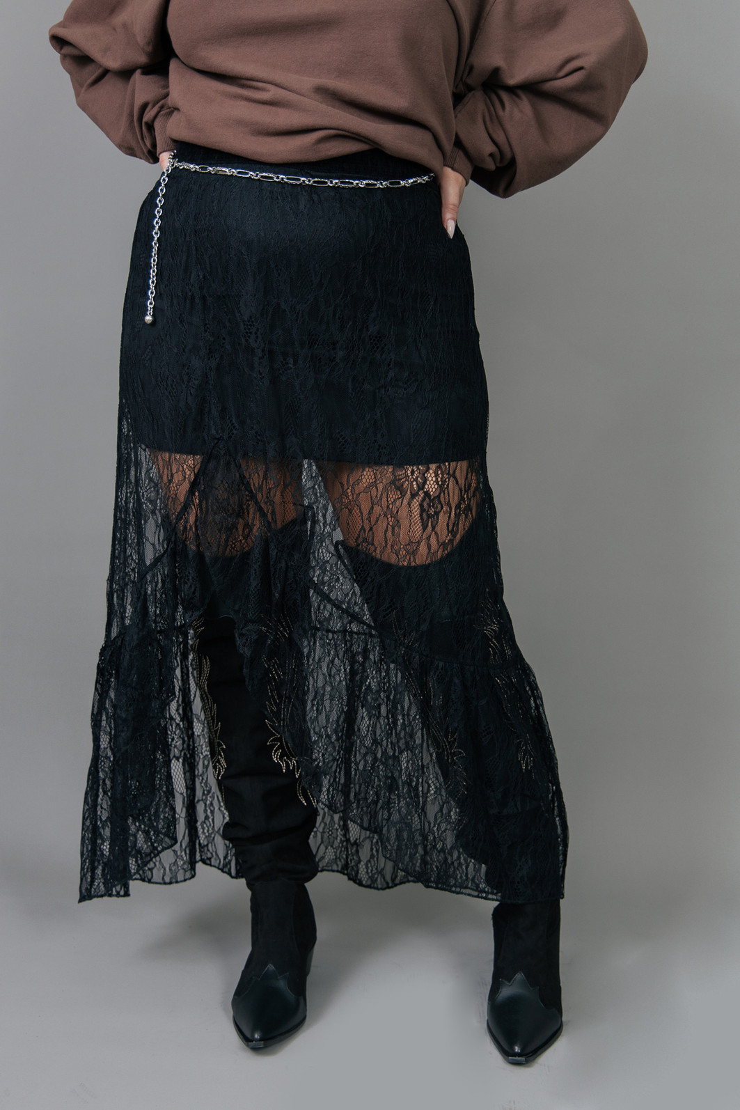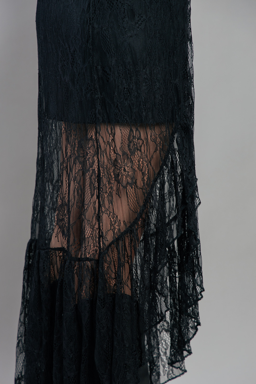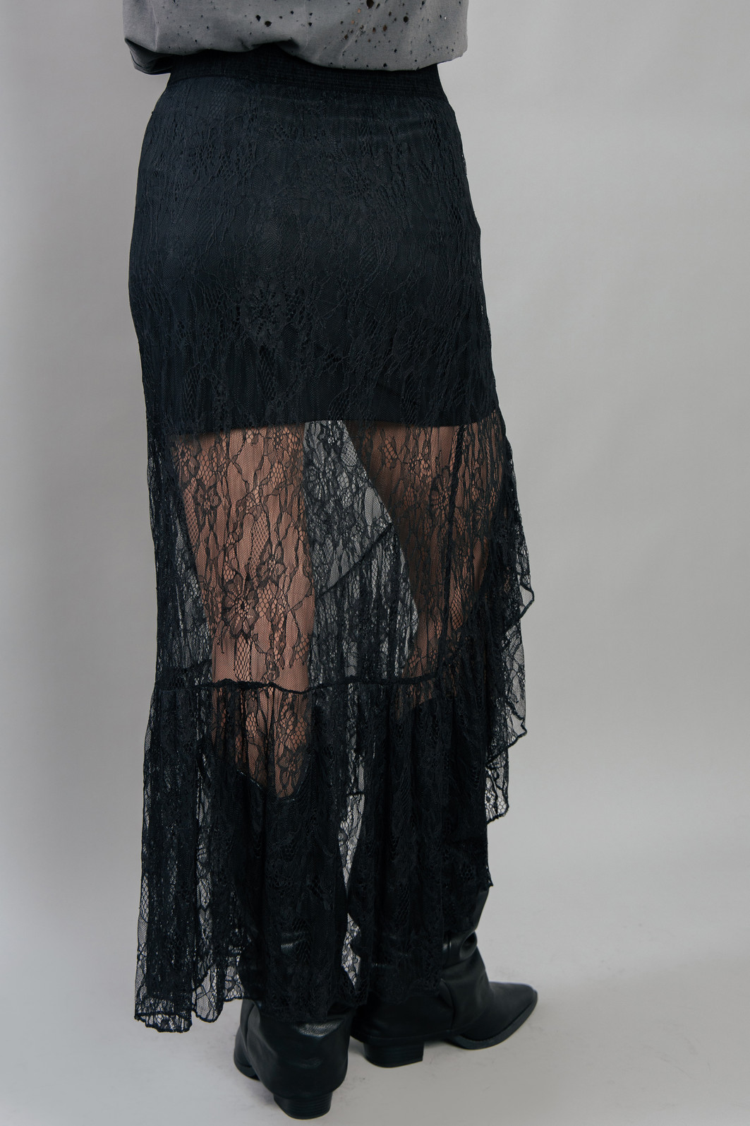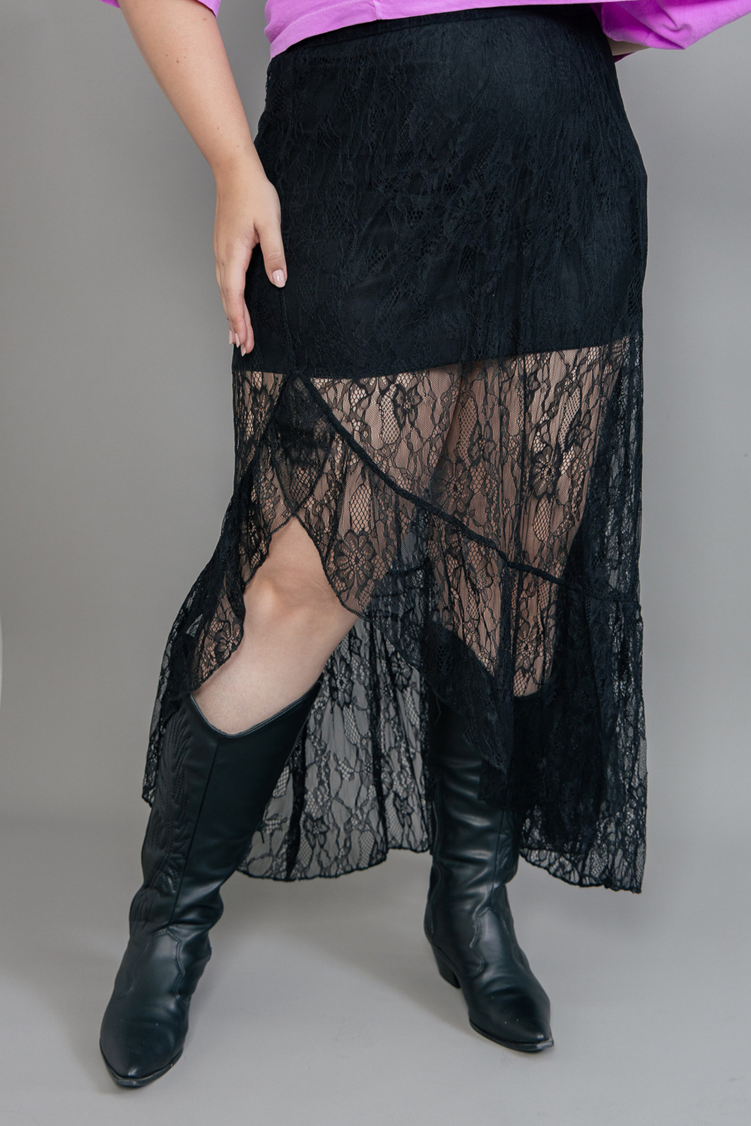 Saia lindíssima com essa renda bem delicada na cor preta. Detalhe na lateral com abertura e babado. Possui forro com elastano e elástico em toda a cintura para melhor ajustar.
