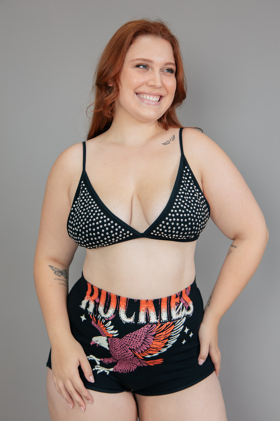 Top em cotton com bastante elastano na cor preta. Apliques de tacha na cor prata em toda a frente. Base com elástico embutido para dar maior sustentação. Alças com regulagem de altura. Não possui bojo.