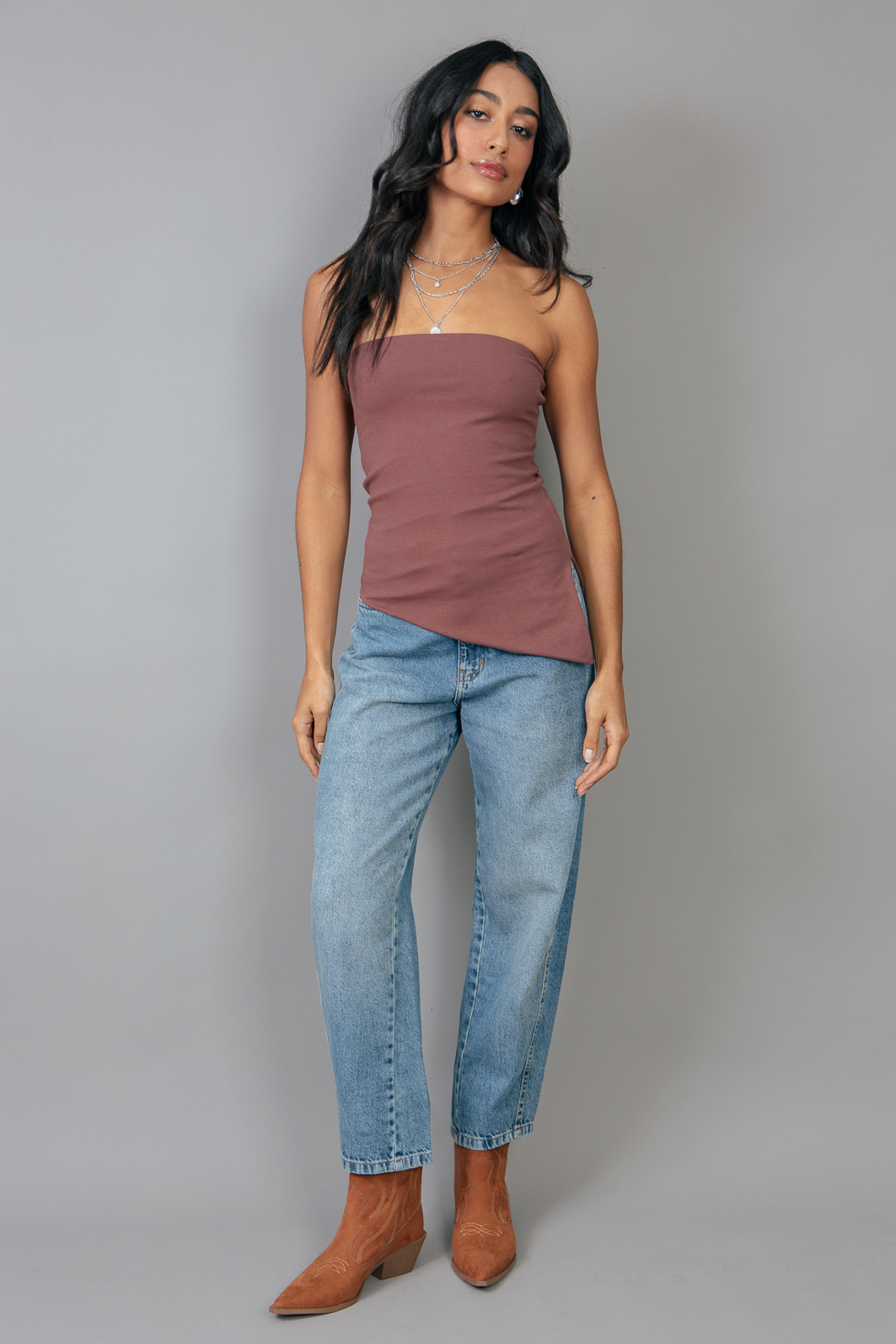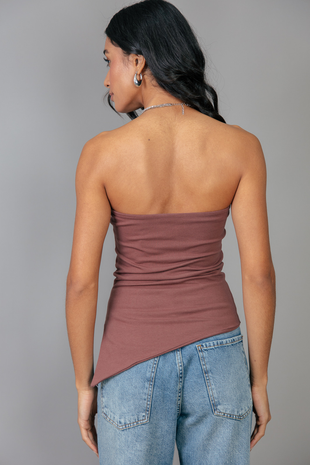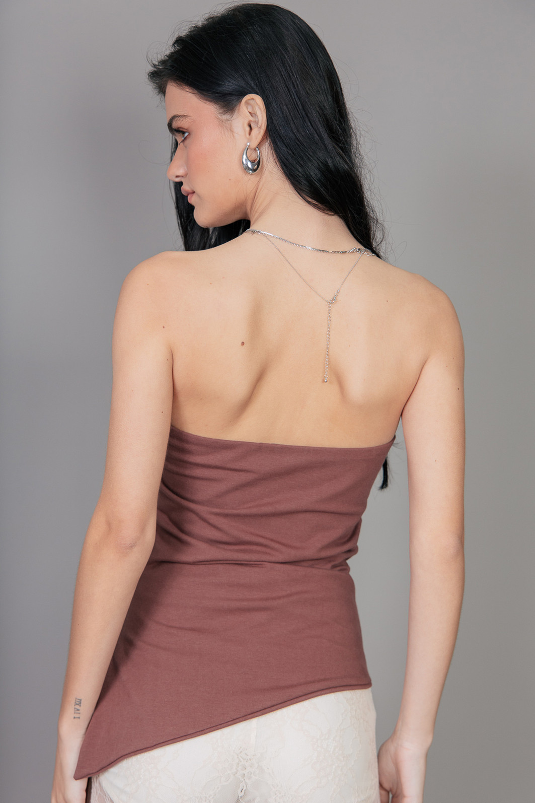 Top sem alças em cotton marrom com bastante elasticidade, assimetria e abertura na lateral.
