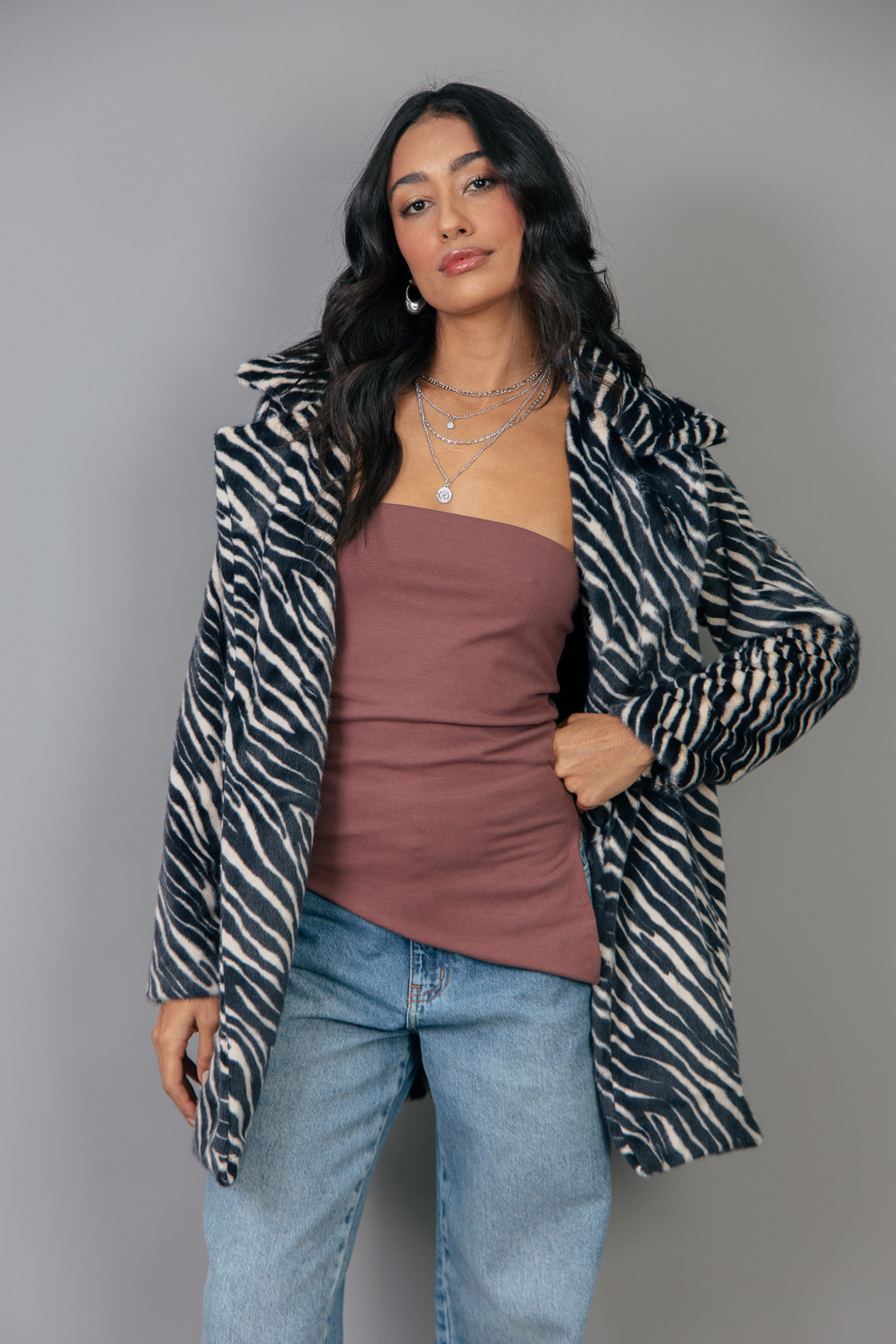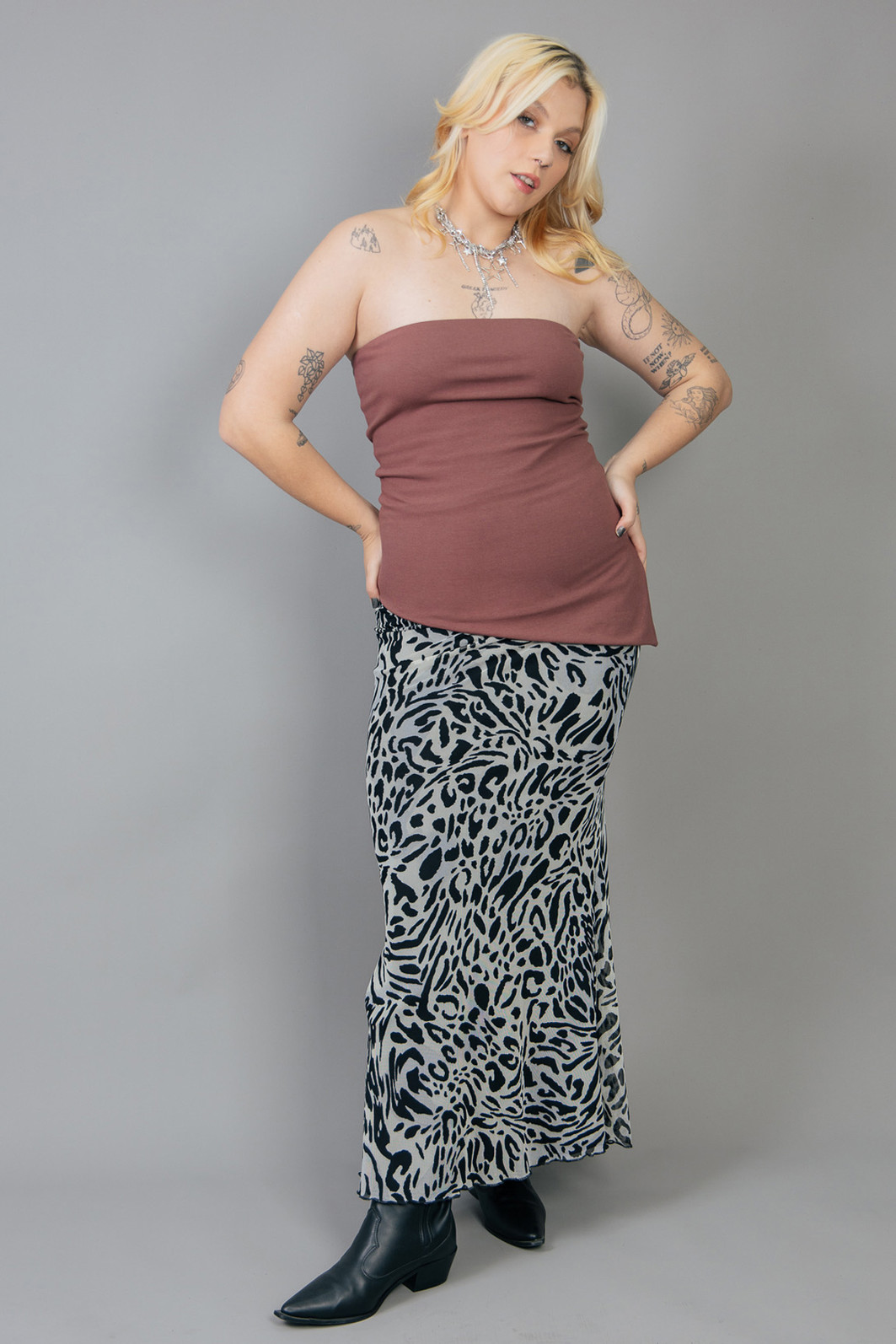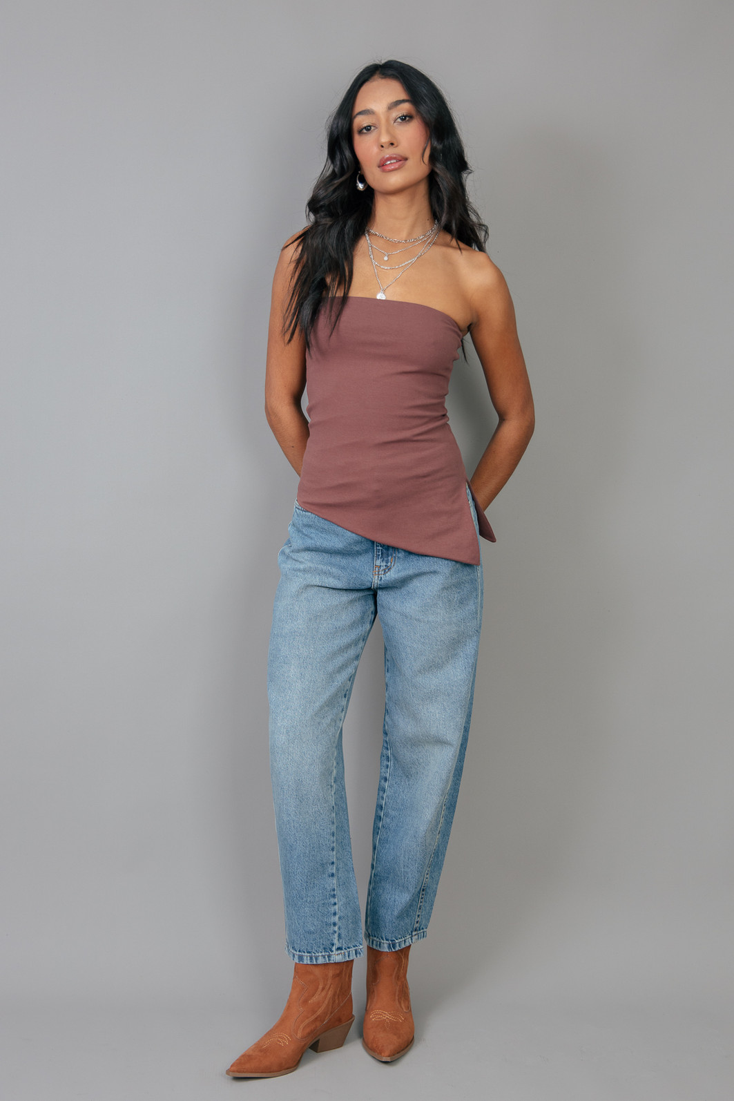 Top sem alças em cotton marrom com bastante elasticidade, assimetria e abertura na lateral.