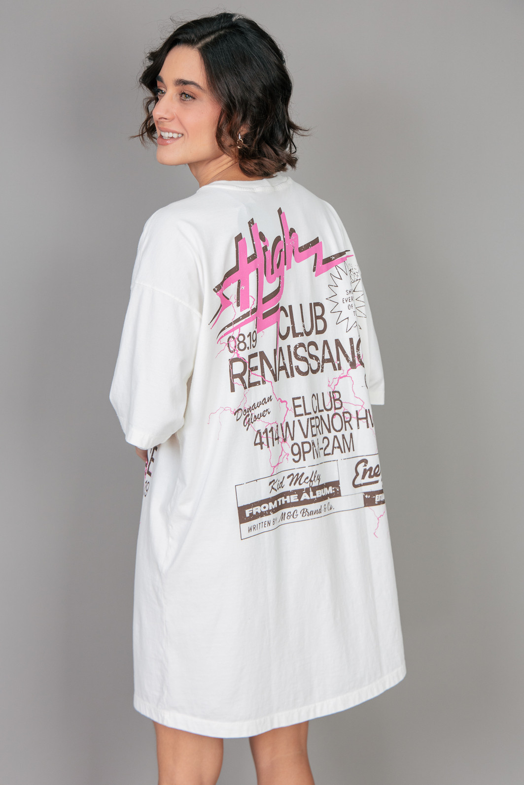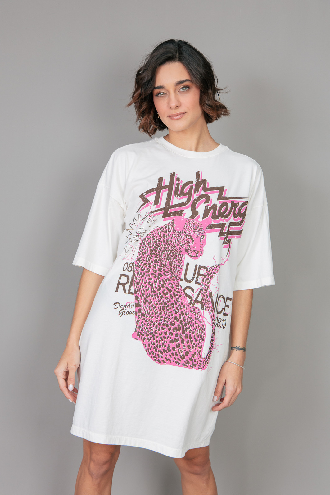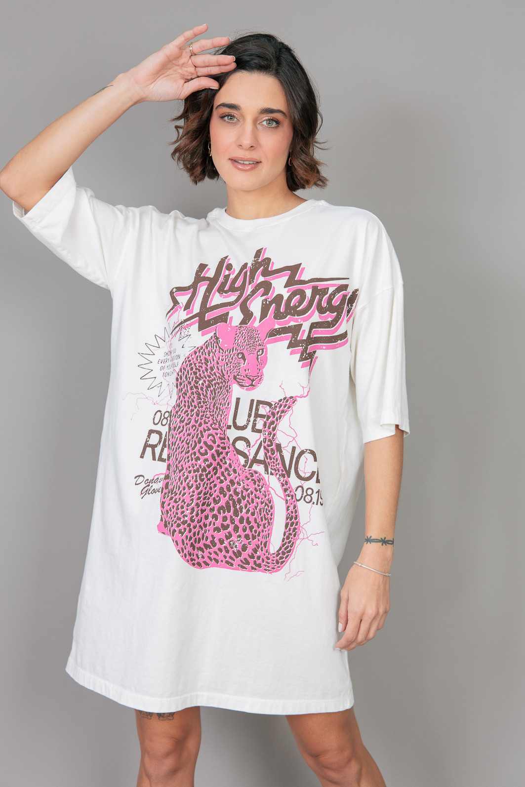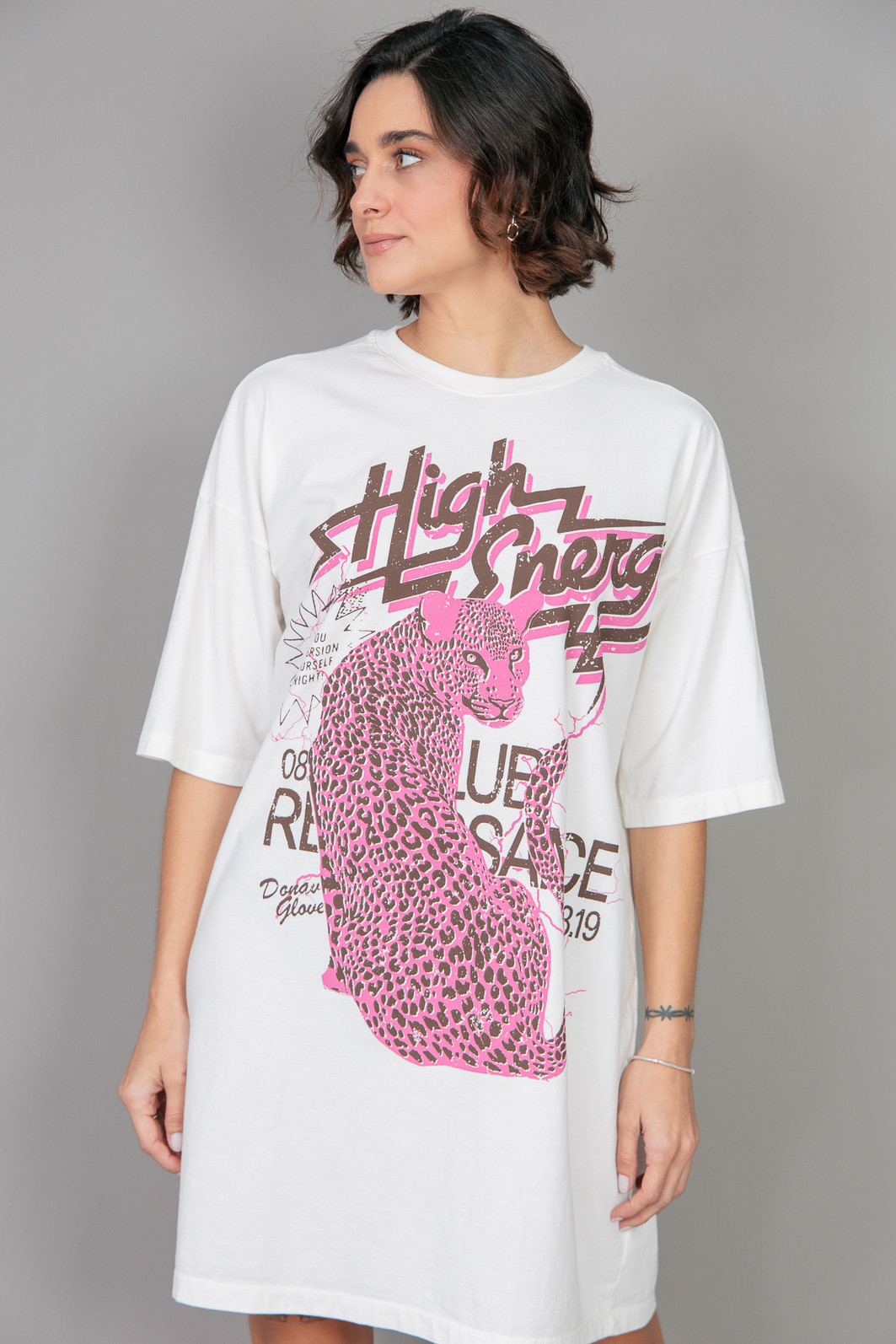 Vestido ou camisetão, use como quiser! Em malha 30/1 na cor off white. Estampa frente e costa. Modelagem mais ampla, por isso, se quiser mais certinha no corpo, opte por um tamanho menor. Dica de estilo: combine essa peça com coletes, kimonos ou jaquetas e arrase nos acessórios.