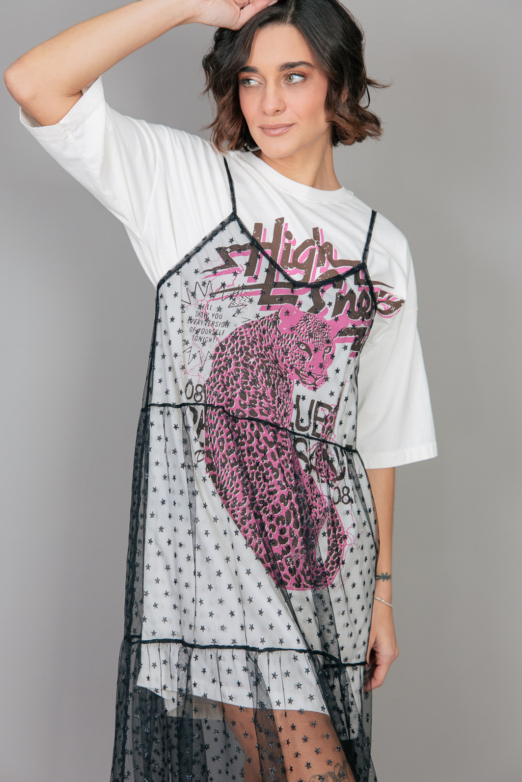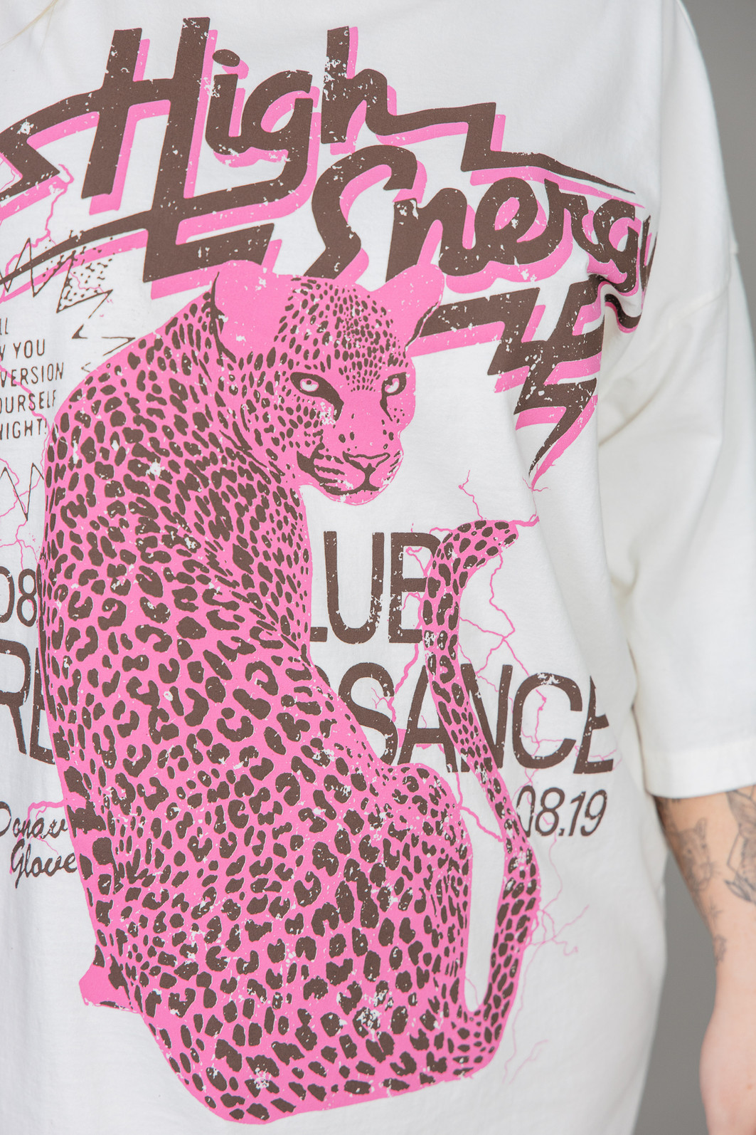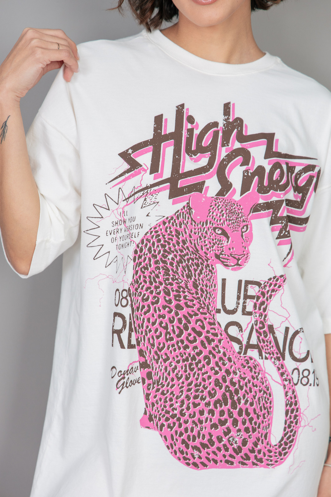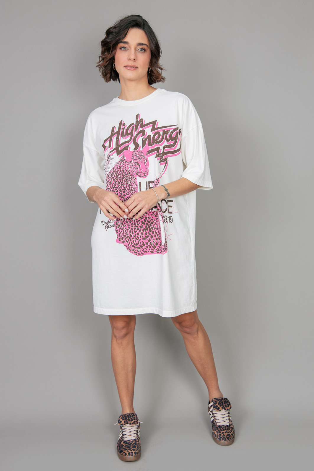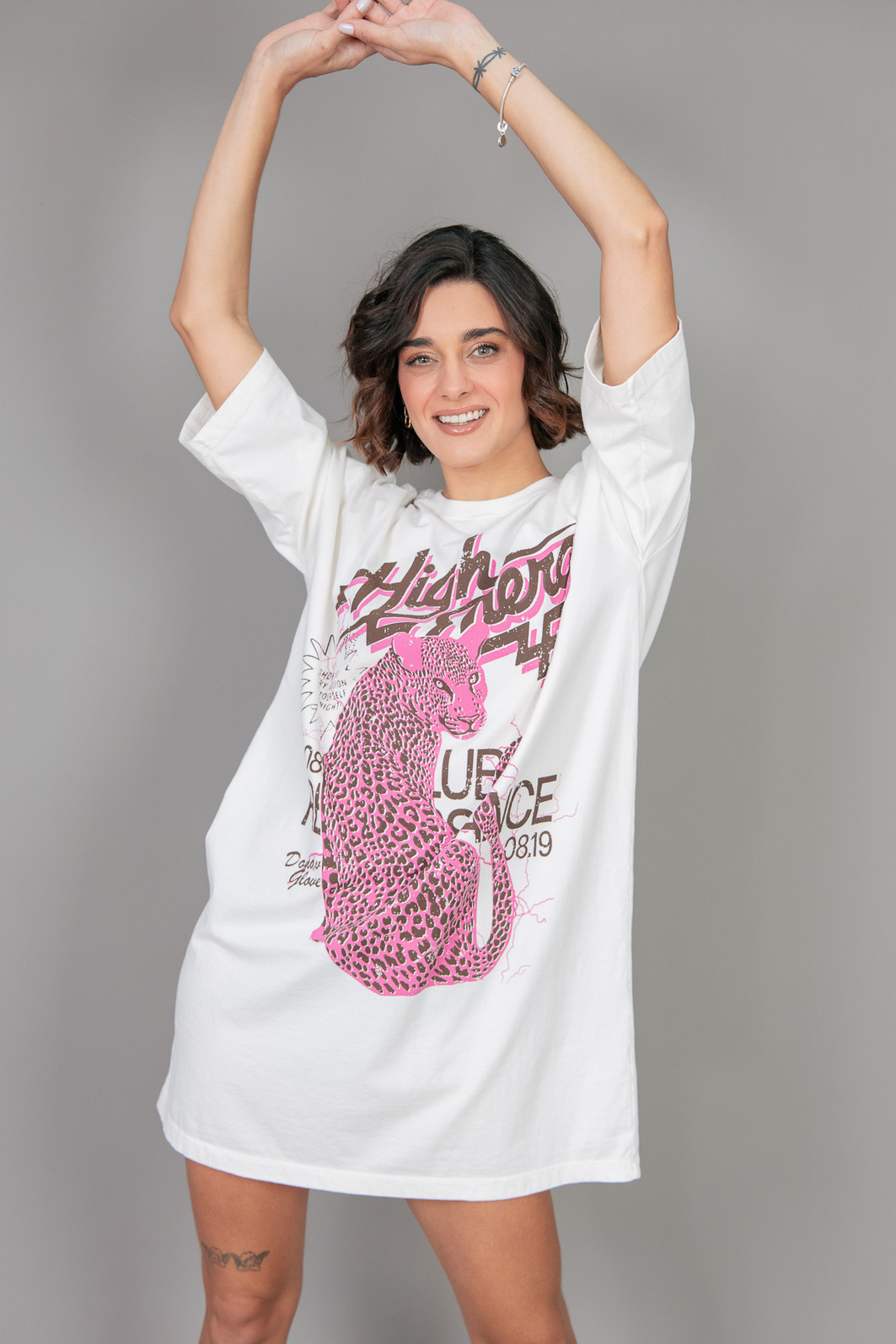 Vestido ou camisetão, use como quiser! Em malha 30/1 na cor off white. Estampa frente e costa. Modelagem mais ampla, por isso, se quiser mais certinha no corpo, opte por um tamanho menor. Dica de estilo: combine essa peça com coletes, kimonos ou jaquetas e arrase nos acessórios.