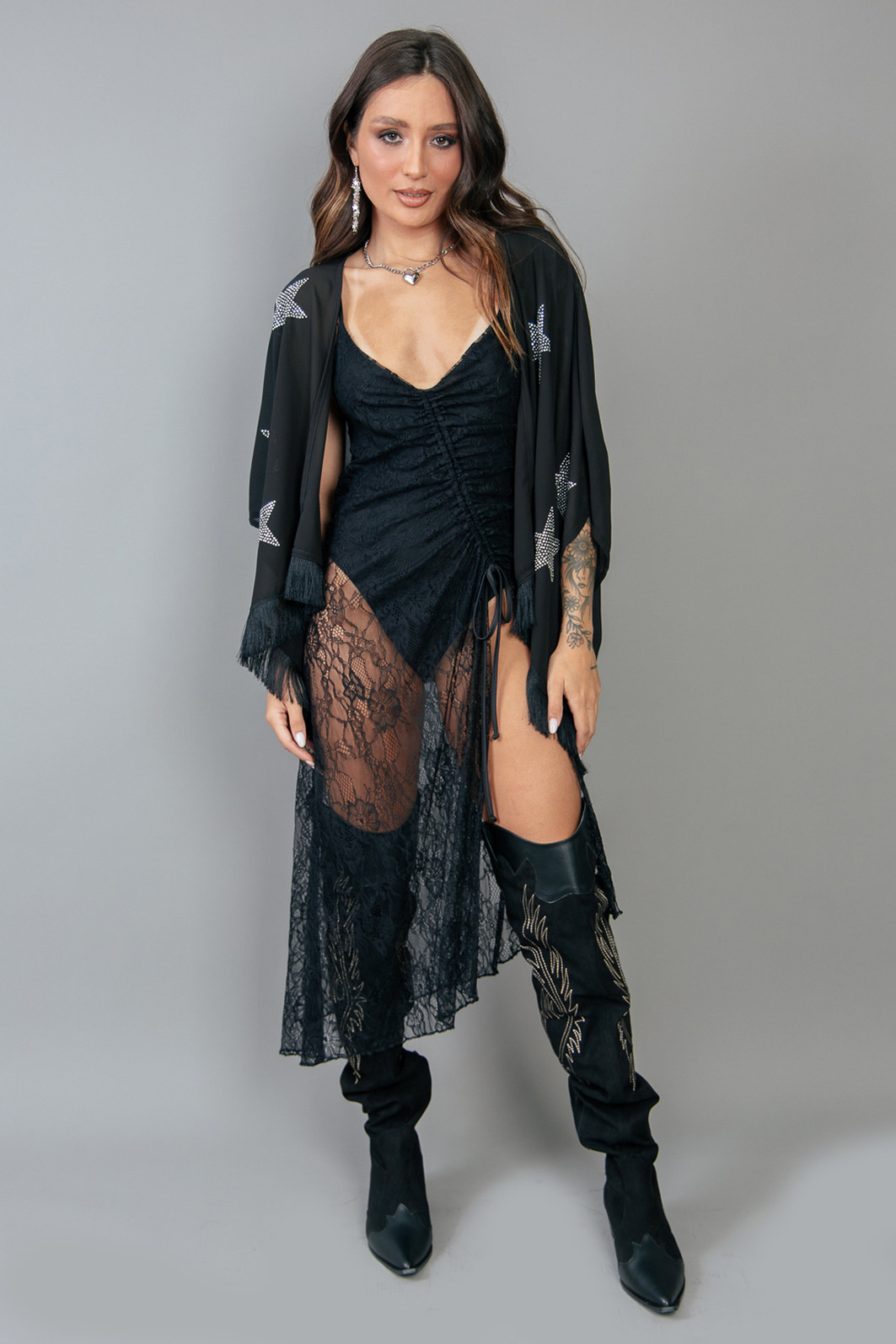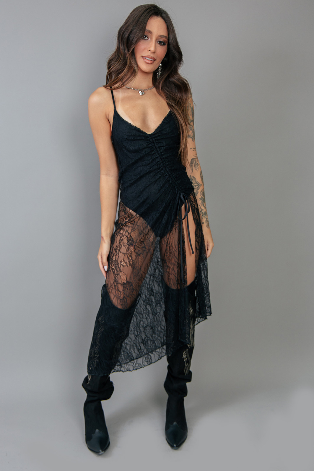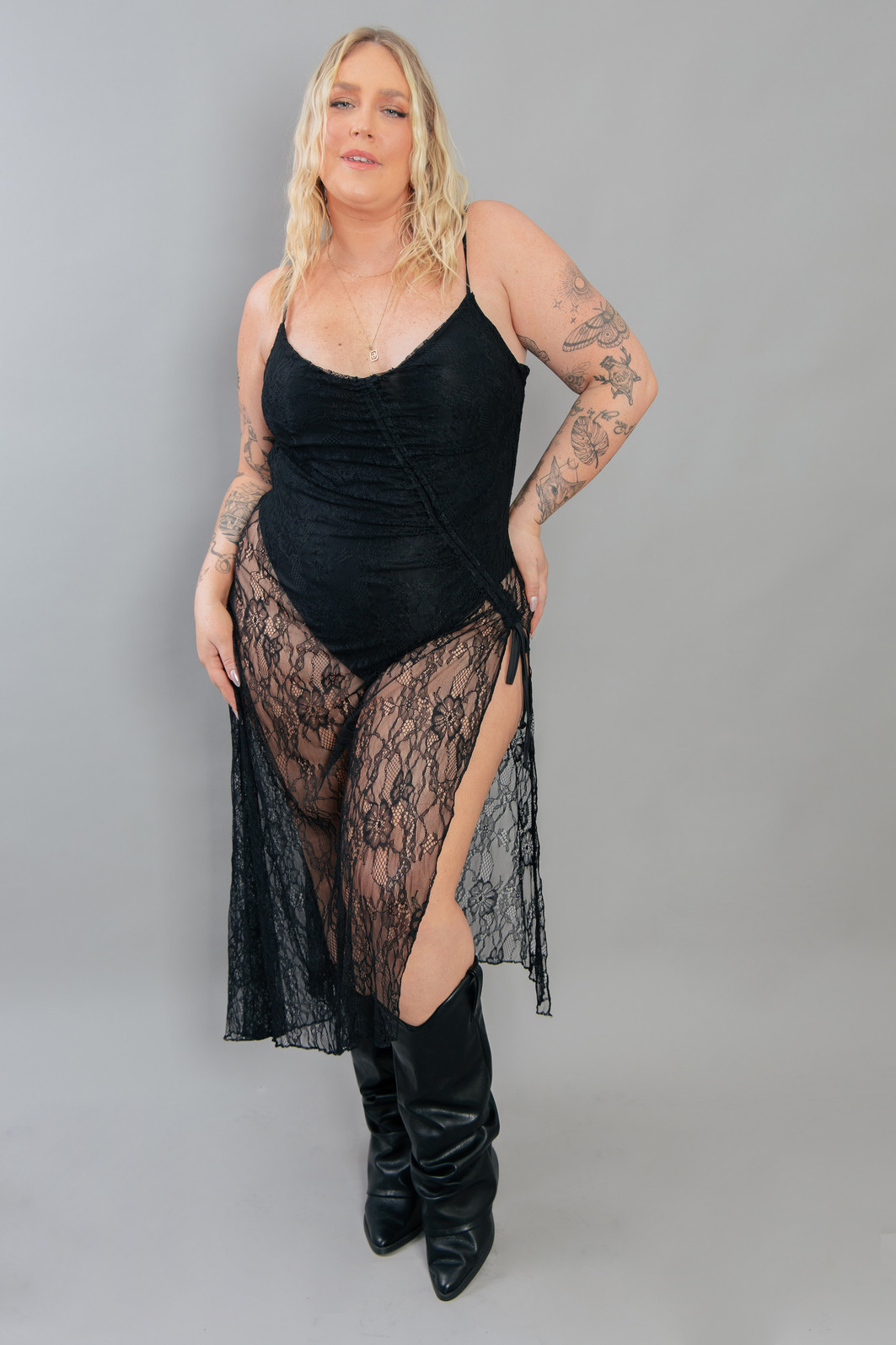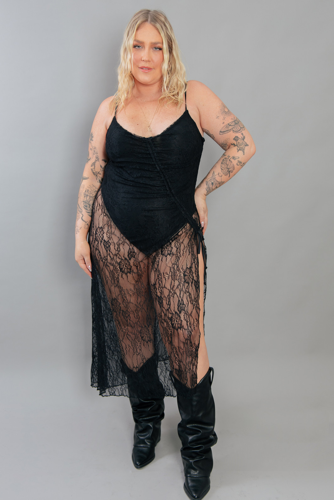 Peça bem diferentona para quem quer arrasar muito no look! Vestido todo transparente em renda preta bem delicada com racha e detalhe para amarrar na lateral. Alças com regulagem para ajustar. Possui forro em formato de body que é costurado junto com o vestido, em tecido na cor preta bem confortável com elastano. Possui zíper na lateral para melhor vestir. Você também pode usar essa peça com short, saia ou calças por cima do body ok? ;)