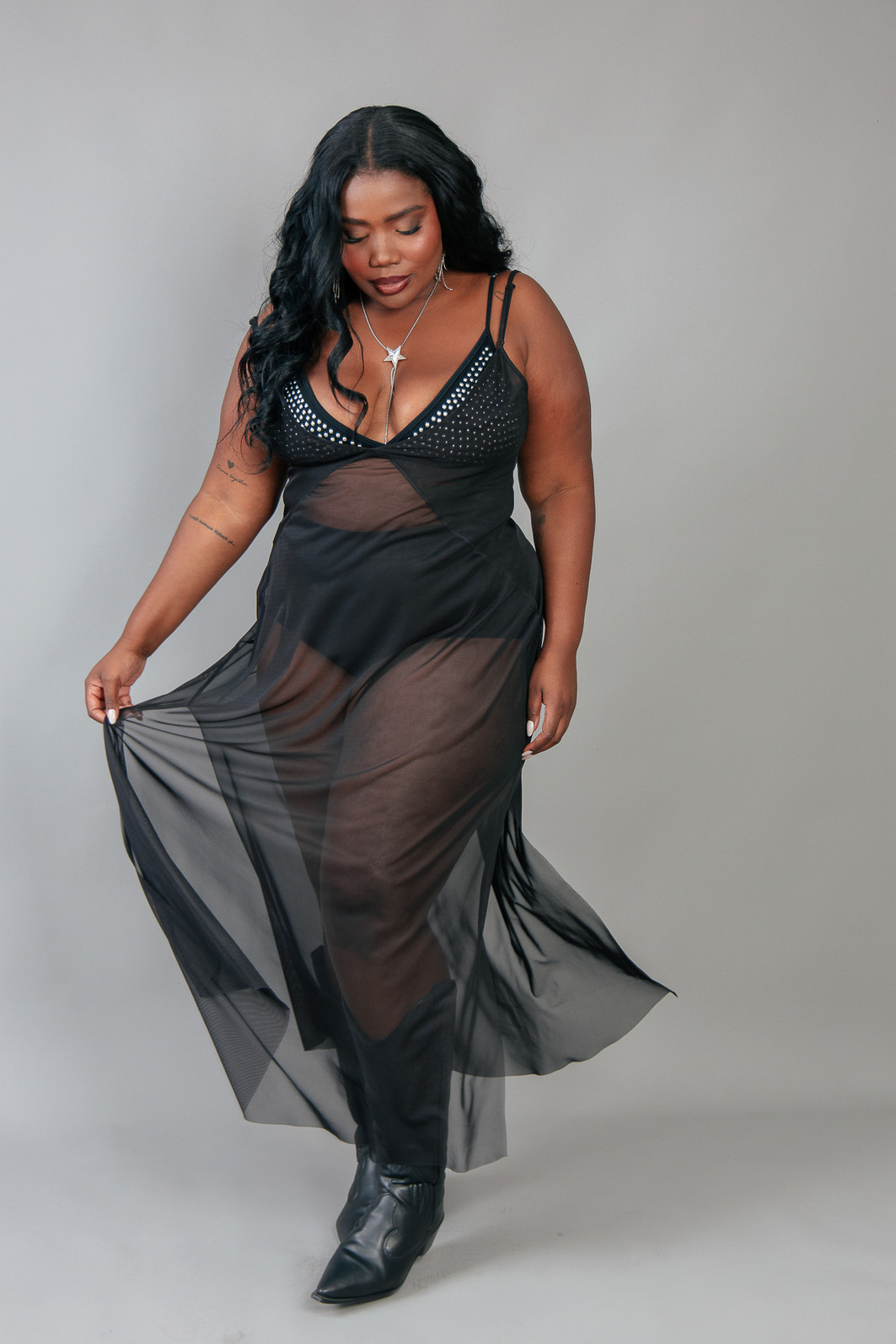 Uma daquelas peças para compor um look único e cheio de estilo! Em tule na cor preta, com decote frente e costa. Comprimento alongado com rachas nas laterais. Alças com ajuste de altura. Peça totalmente transparente, ideal para sobrepor a tops, camisetas, jeans ou outros vestidos.