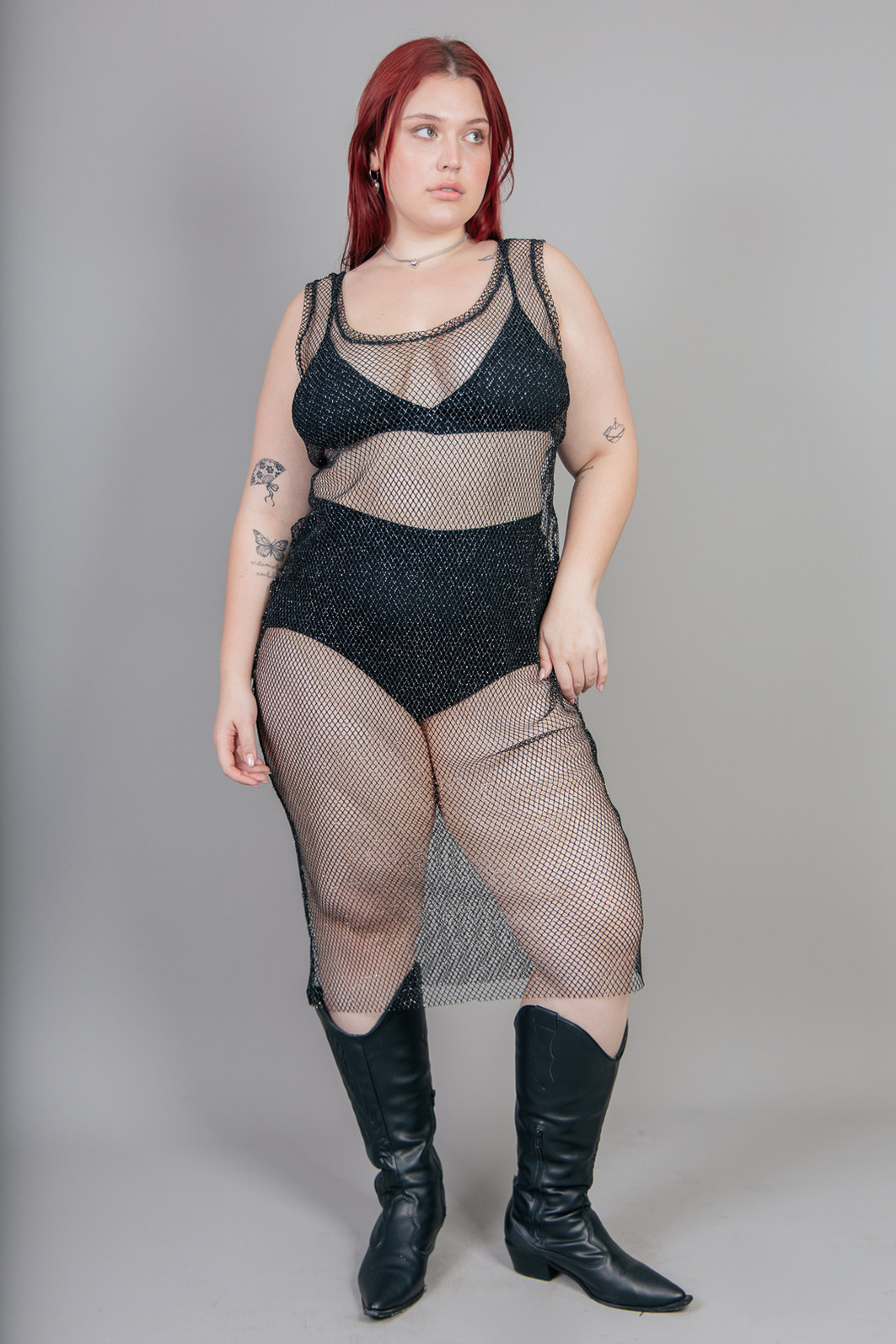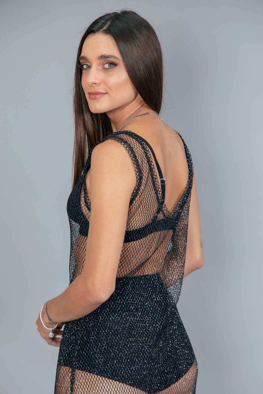 Uma peça para deixar qualquer look super estiloso! Em tecido de tela cor preta com aplicação de glitter prata. Modelagem estilo regata, mais retinho no corpo, super confortável pois possui elastano na composição.