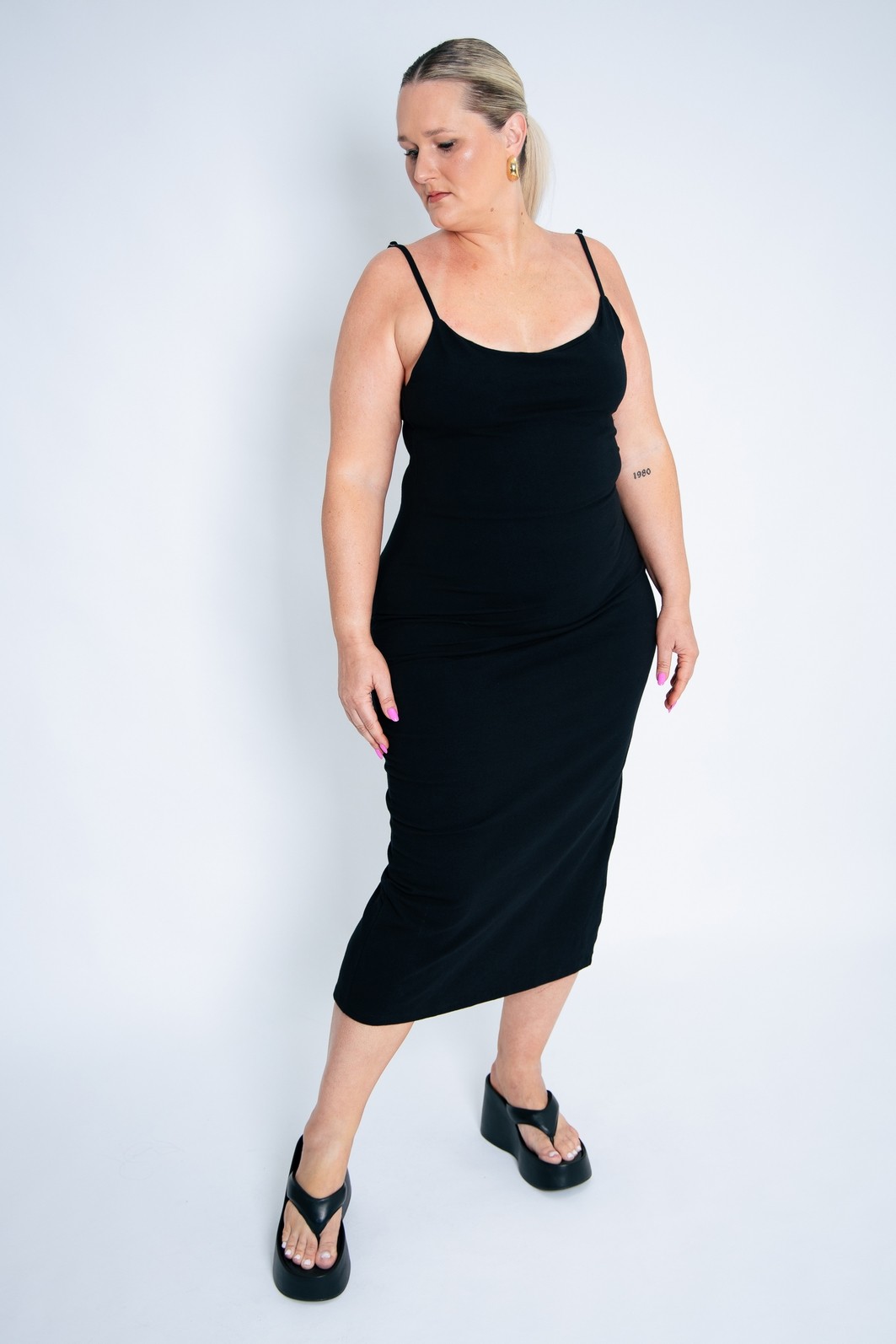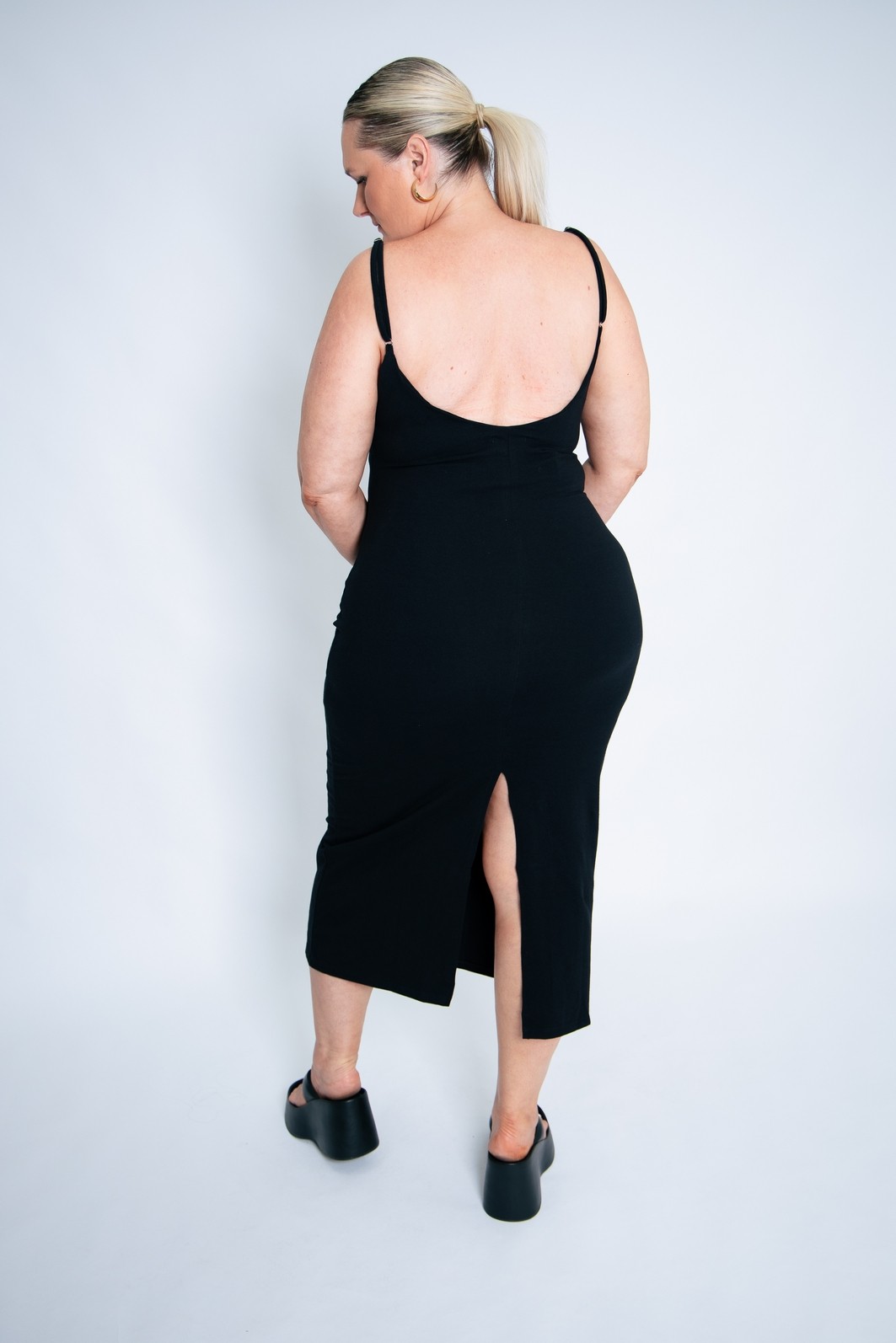 Vestido super confortável e que modela bem o corpo. Tecido em cotton de algodão com elastano na cor preta. Alças com regulagem para melhor ajustar. Tecido duplo na parte do busto e racha na parte de trás.
